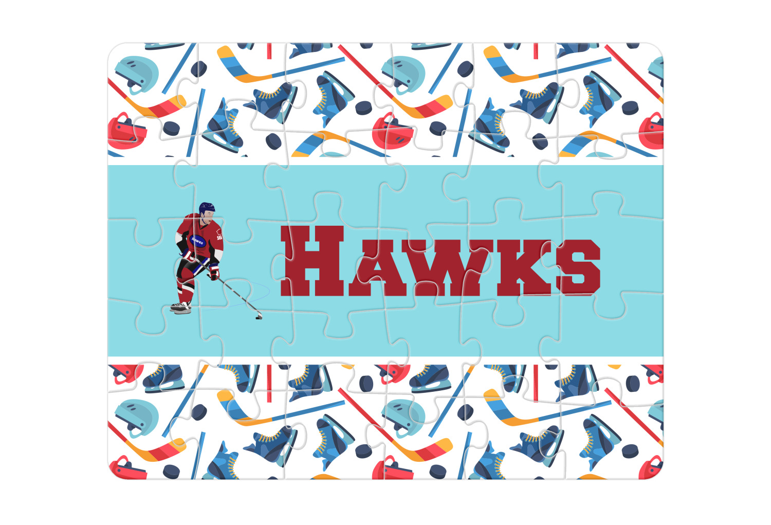 The main design has a fun background with illustrated hockey equipment including a helmet, hockey puck, skate, and hockey sticks. Going through the middle of the design is a solid strip of light teal with a graphic of a hockey player alongside a team name. The coordinating design uses this solid teal background with a hockey stick graphic and personalization.