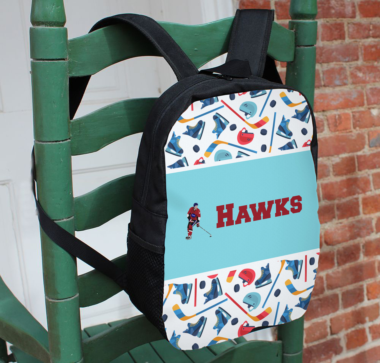 The main design has a fun background with illustrated hockey equipment including a helmet, hockey puck, skate, and hockey sticks. Going through the middle of the design is a solid strip of light teal with a graphic of a hockey player alongside a team name. The coordinating design uses this solid teal background with a hockey stick graphic and personalization.