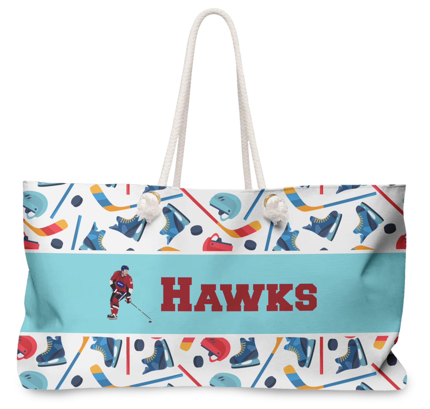 Our oversized weekender tote with rope handles is perfect for your weekend at the beach or on the town. This large tote are 24" W X 13" H, with a 5" gusset and a 27" thick rope handles with a knot that is put through a grommeted brass hole.