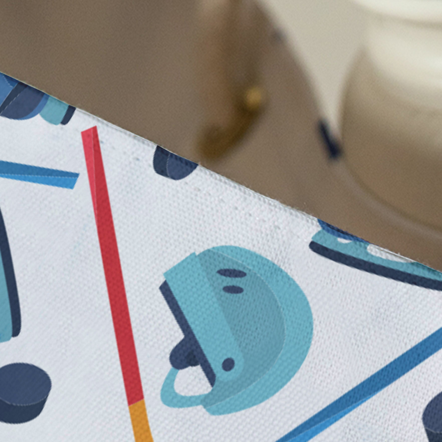 The main design has a fun background with illustrated hockey equipment including a helmet, hockey puck, skate, and hockey sticks. Going through the middle of the design is a solid strip of light teal with a graphic of a hockey player alongside a team name. The coordinating design uses this solid teal background with a hockey stick graphic and personalization.