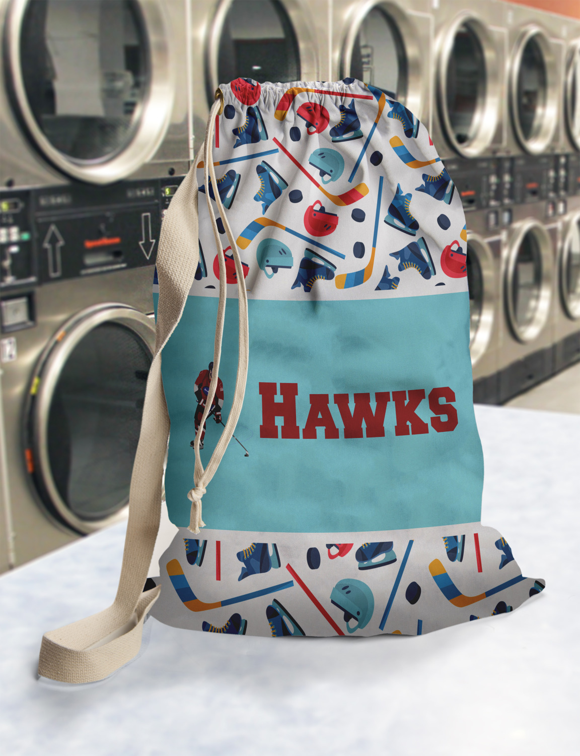 Carry your laundry in style with these customized laundry bags. Available in two sizes, featuring a natural colored woven strap and a cinch cord, these bags hold a lot of clothes or anything else you want to fit in them.