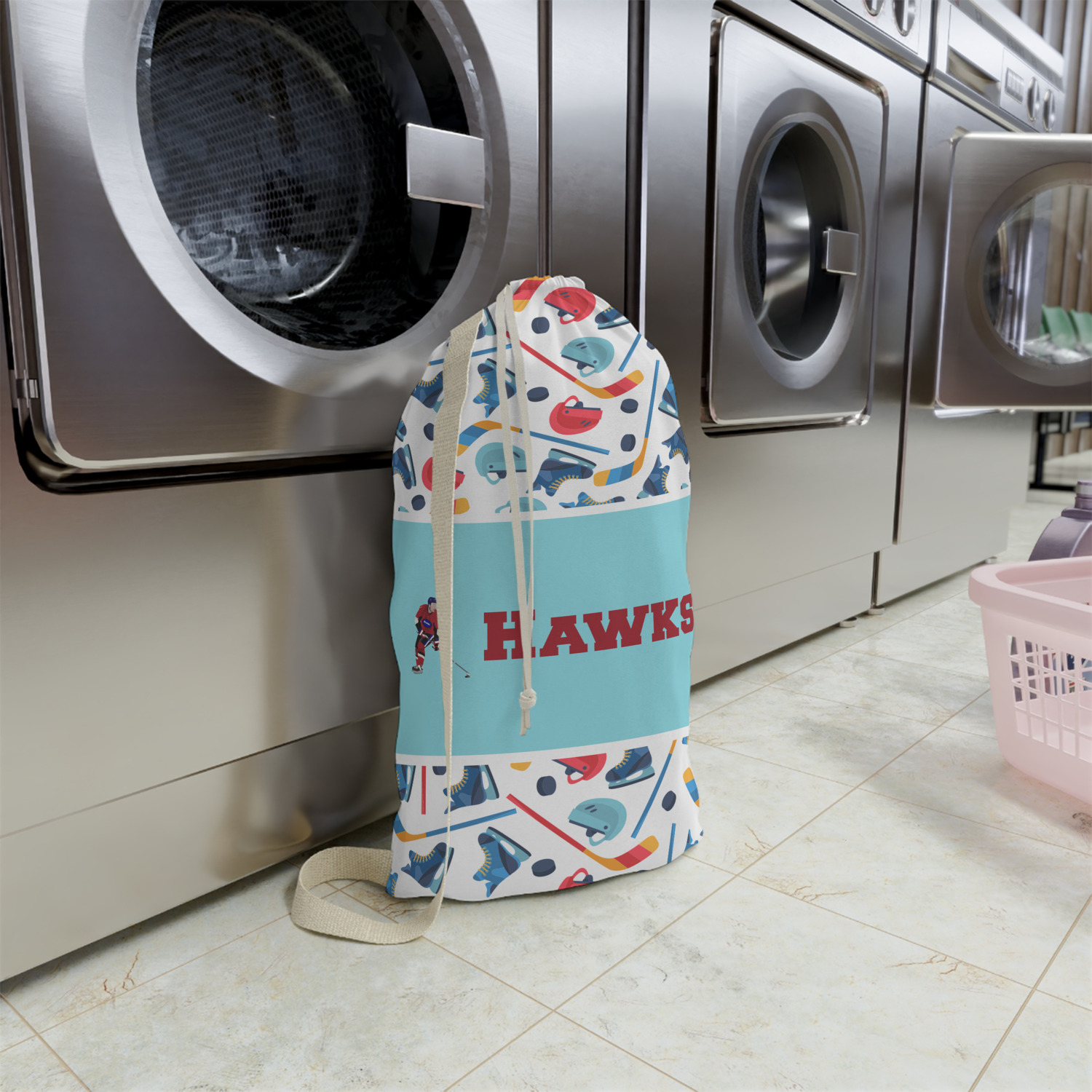 Carry your laundry in style with these customized laundry bags. Available in two sizes, featuring a natural colored woven strap and a cinch cord, these bags hold a lot of clothes or anything else you want to fit in them.