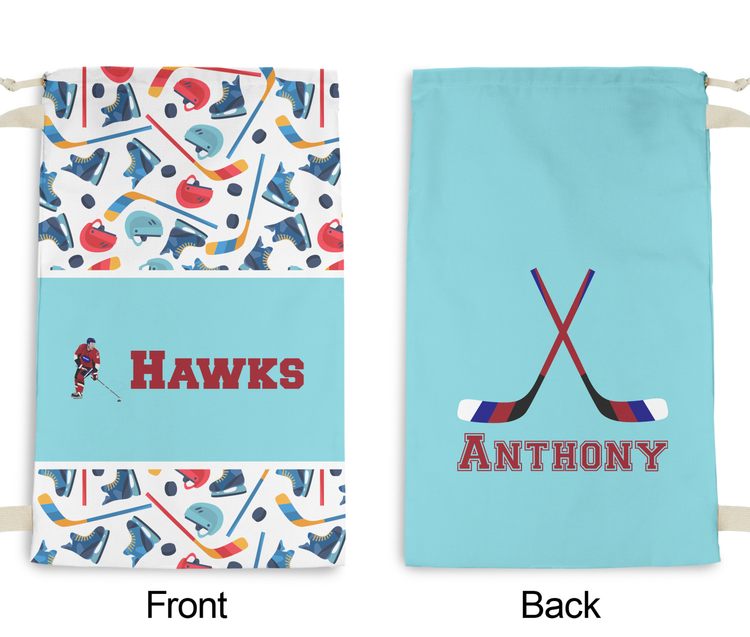 The main design has a fun background with illustrated hockey equipment including a helmet, hockey puck, skate, and hockey sticks. Going through the middle of the design is a solid strip of light teal with a graphic of a hockey player alongside a team name. The coordinating design uses this solid teal background with a hockey stick graphic and personalization.