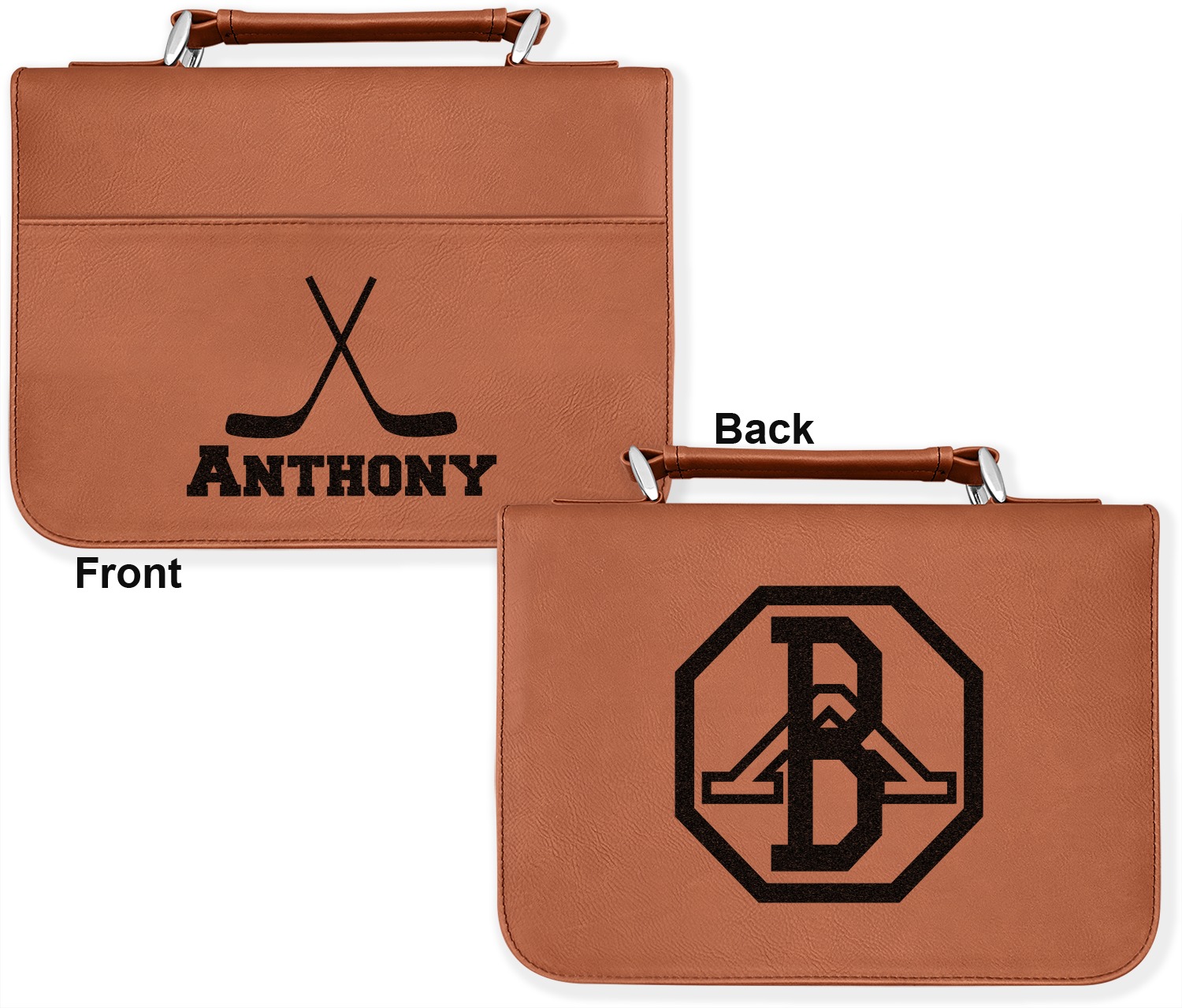 These book covers are fabricated from a fine leatherette in a warm, cognac shade of brown. A wide pocket spans across the front of the book jacket [2,400] and can store any loose papers or notes that you wish to keep. The interior of this personalized Bible cover includes slots on both sides to house the covers of your Bible, and keep it in place. The inside of the spine has a small elastic band to secure a pen. A zipper lines three sides of the cover, while the fourth side features a reinforced handle that allows for easy transport of your enclosed book.