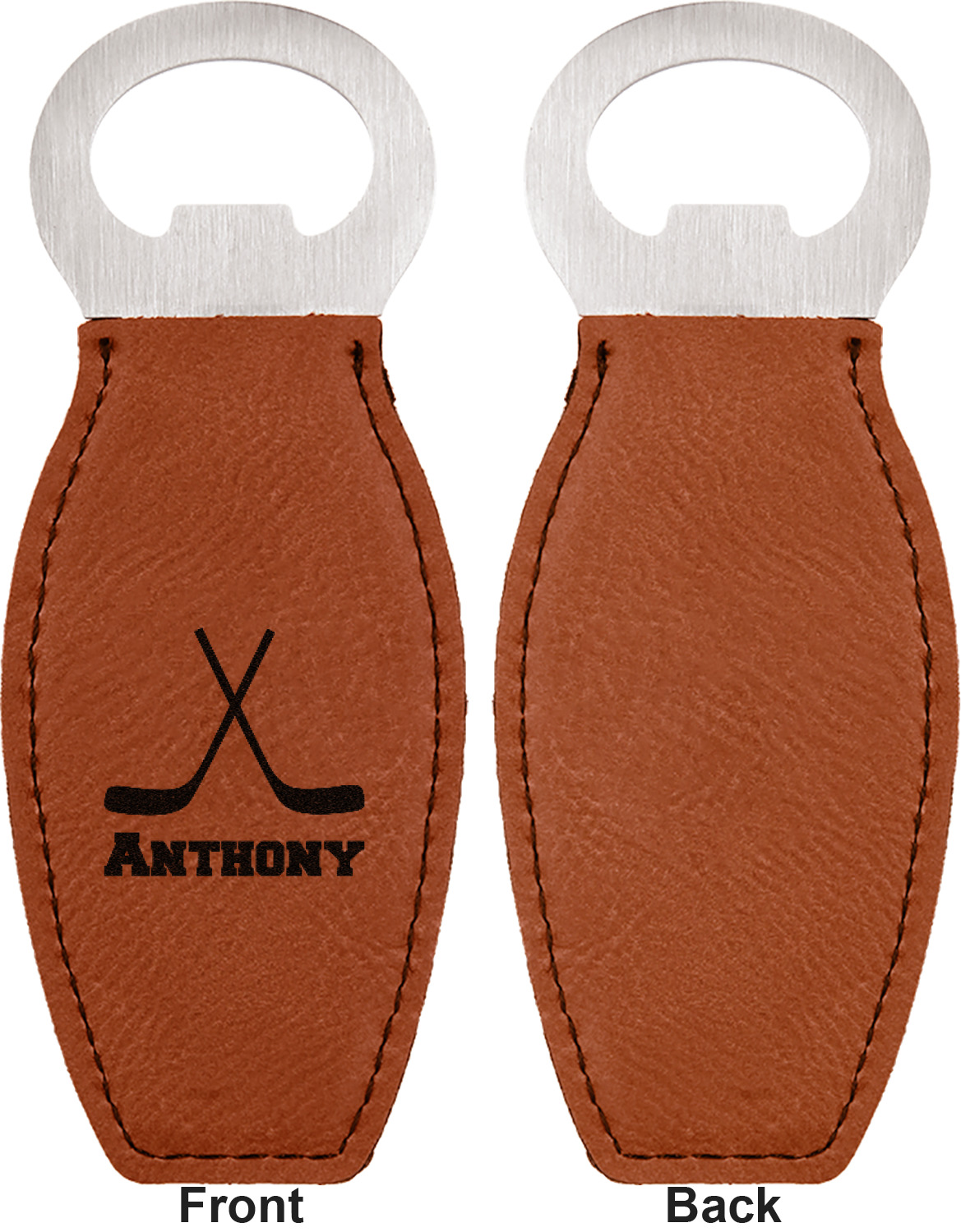 Built from stainless steel, these custom bottle openers are wrapped in a cognac-colored leatherette. Sharp, black stitching lines the edges for extra durability and a finished touch. Your personalization is laser-engraved onto the surface of this leatherette, leaving behind a crisp, black coloration. At 4.6 by 1.8 inches, this beer bottle opener gives you much of leverage when trying to open a stubborn bottle. On the opposite end of the opener, you'll find a magnet that you can use to display your new, unique bottle opener!