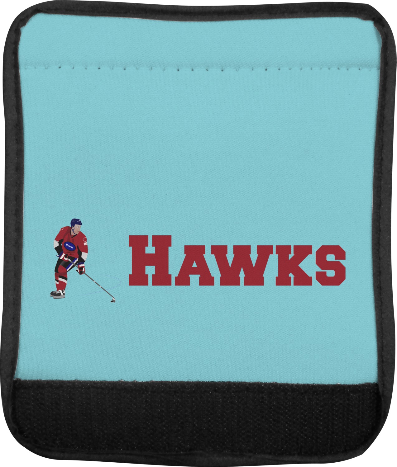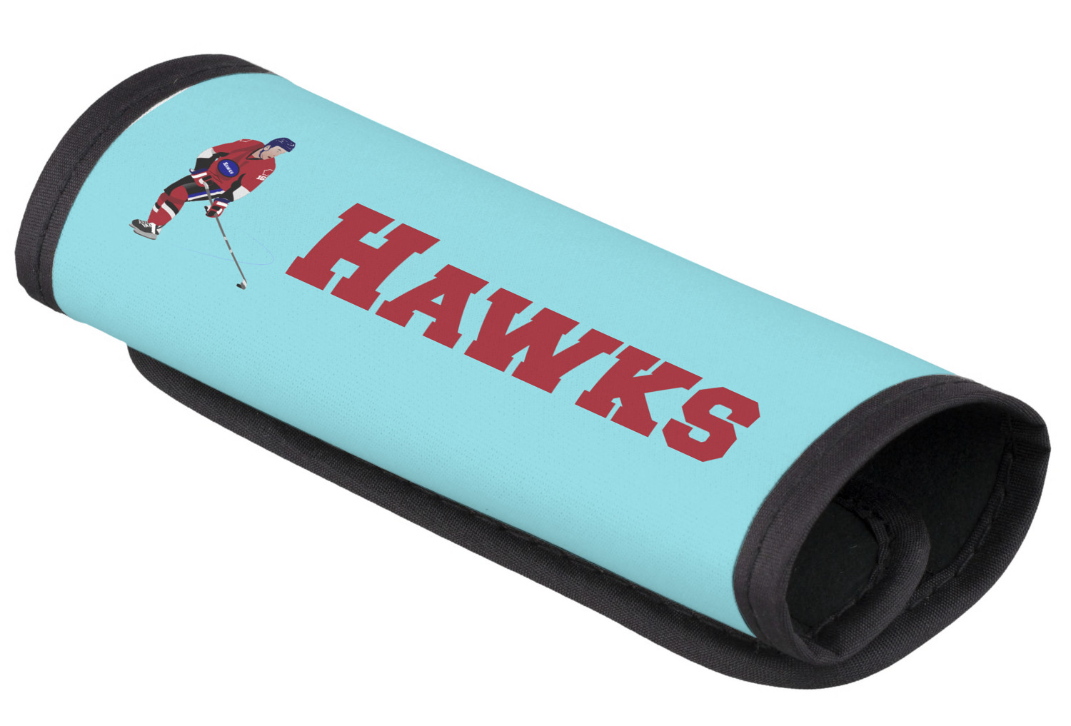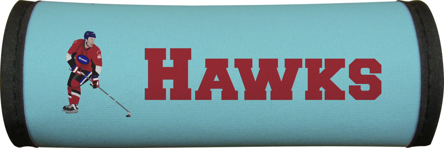 The main design has a fun background with illustrated hockey equipment including a helmet, hockey puck, skate, and hockey sticks. Going through the middle of the design is a solid strip of light teal with a graphic of a hockey player alongside a team name. The coordinating design uses this solid teal background with a hockey stick graphic and personalization.