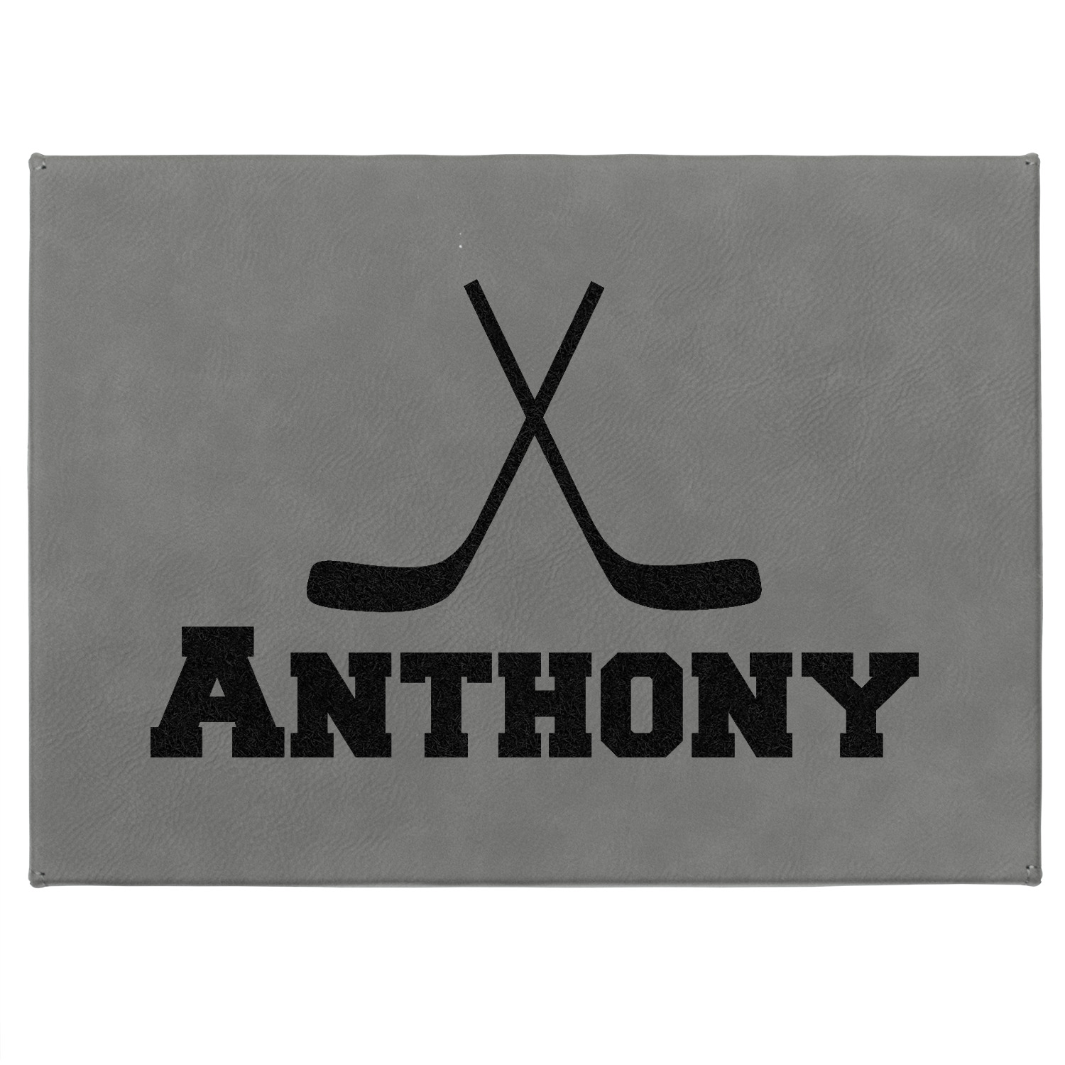 The main design has a fun background with illustrated hockey equipment including a helmet, hockey puck, skate, and hockey sticks. Going through the middle of the design is a solid strip of light teal with a graphic of a hockey player alongside a team name. The coordinating design uses this solid teal background with a hockey stick graphic and personalization.