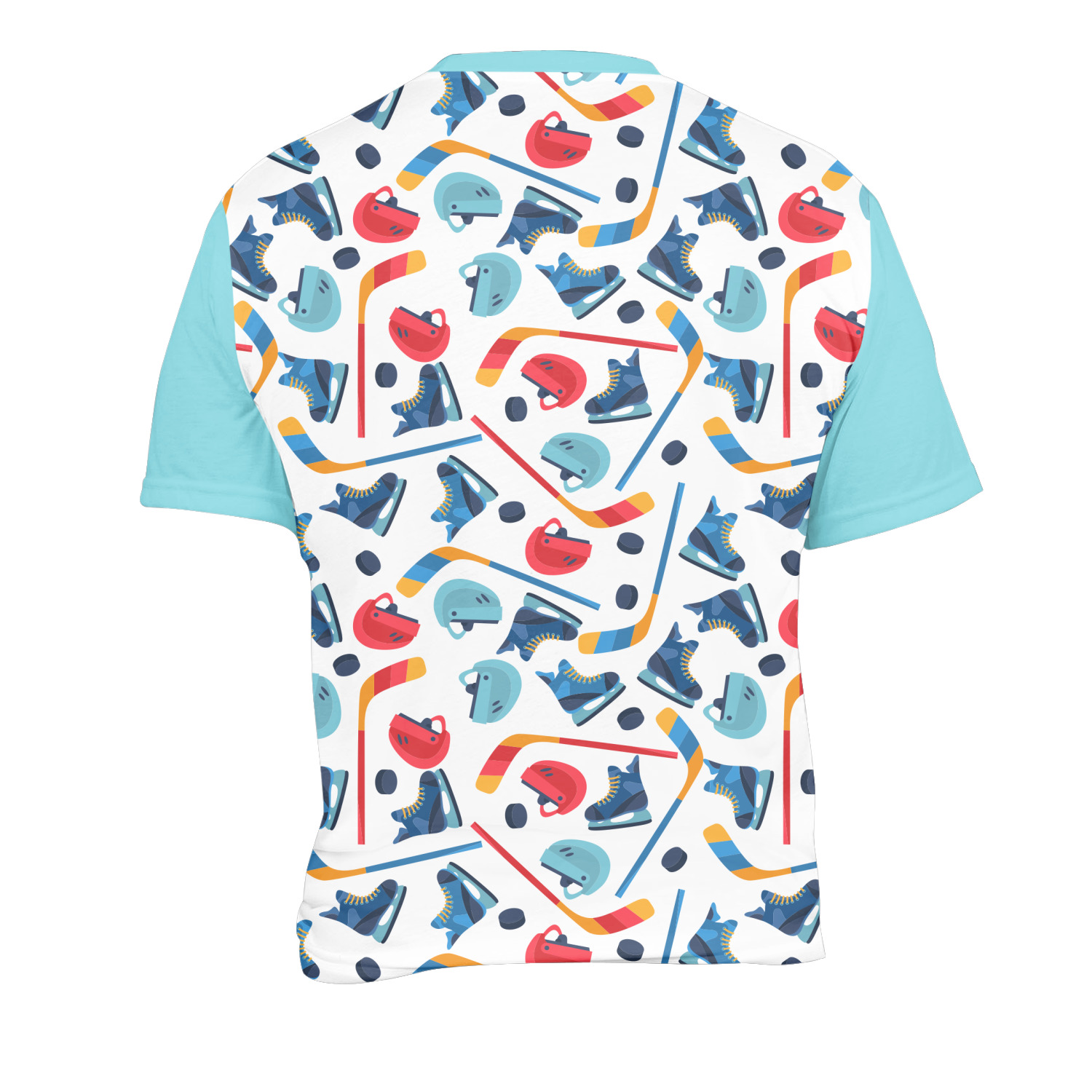 The main design has a fun background with illustrated hockey equipment including a helmet, hockey puck, skate, and hockey sticks. Going through the middle of the design is a solid strip of light teal with a graphic of a hockey player alongside a team name. The coordinating design uses this solid teal background with a hockey stick graphic and personalization.