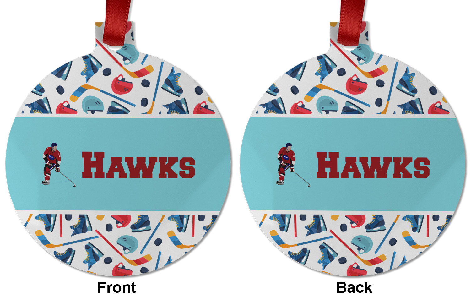 The main design has a fun background with illustrated hockey equipment including a helmet, hockey puck, skate, and hockey sticks. Going through the middle of the design is a solid strip of light teal with a graphic of a hockey player alongside a team name. The coordinating design uses this solid teal background with a hockey stick graphic and personalization.