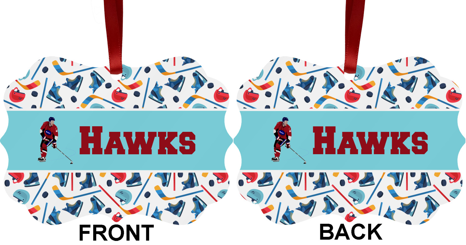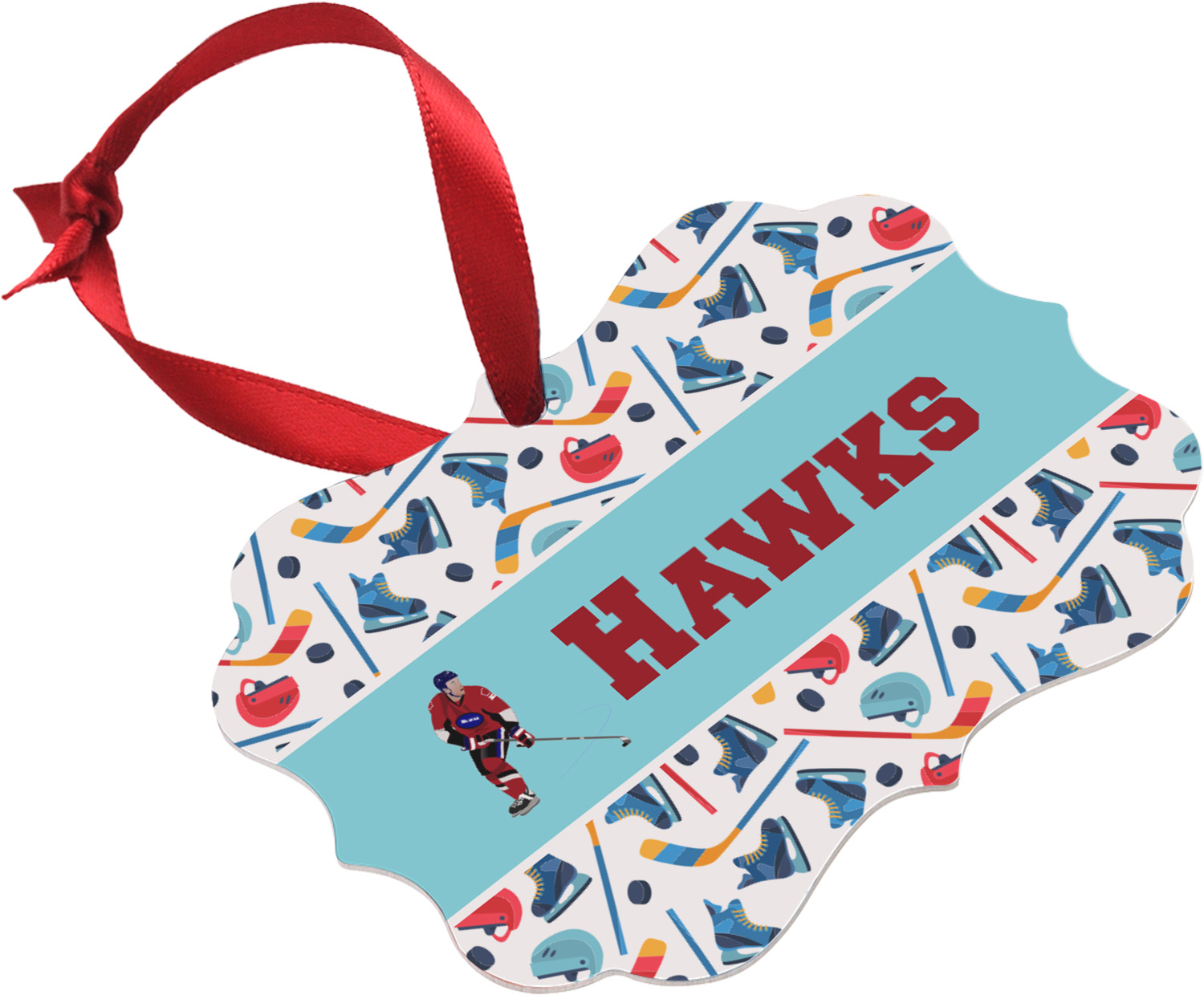 The main design has a fun background with illustrated hockey equipment including a helmet, hockey puck, skate, and hockey sticks. Going through the middle of the design is a solid strip of light teal with a graphic of a hockey player alongside a team name. The coordinating design uses this solid teal background with a hockey stick graphic and personalization.