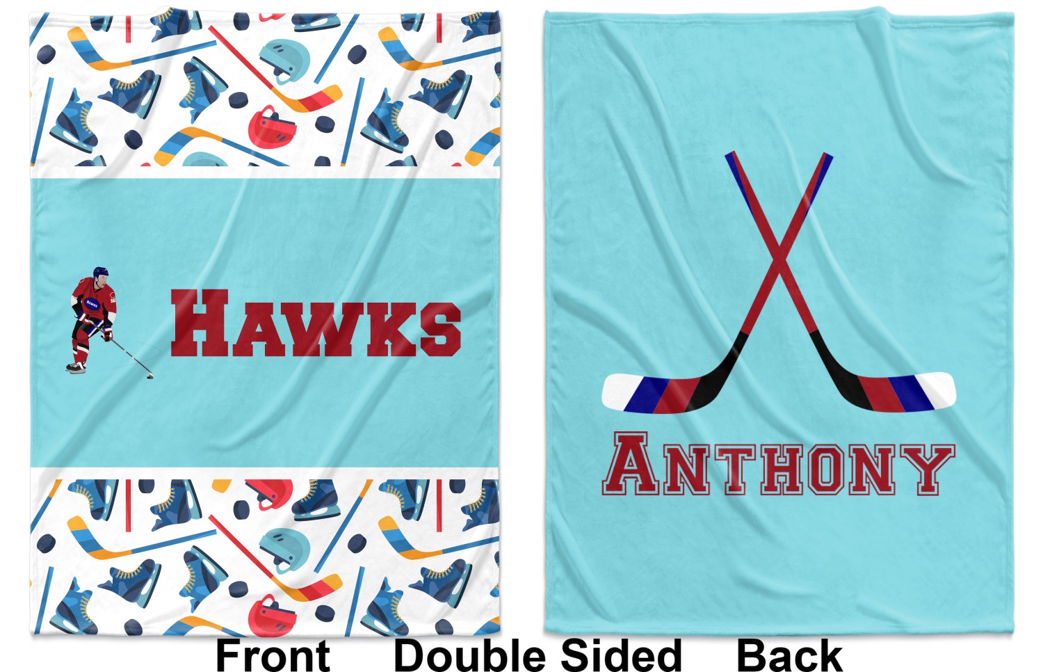 The main design has a fun background with illustrated hockey equipment including a helmet, hockey puck, skate, and hockey sticks. Going through the middle of the design is a solid strip of light teal with a graphic of a hockey player alongside a team name. The coordinating design uses this solid teal background with a hockey stick graphic and personalization.
