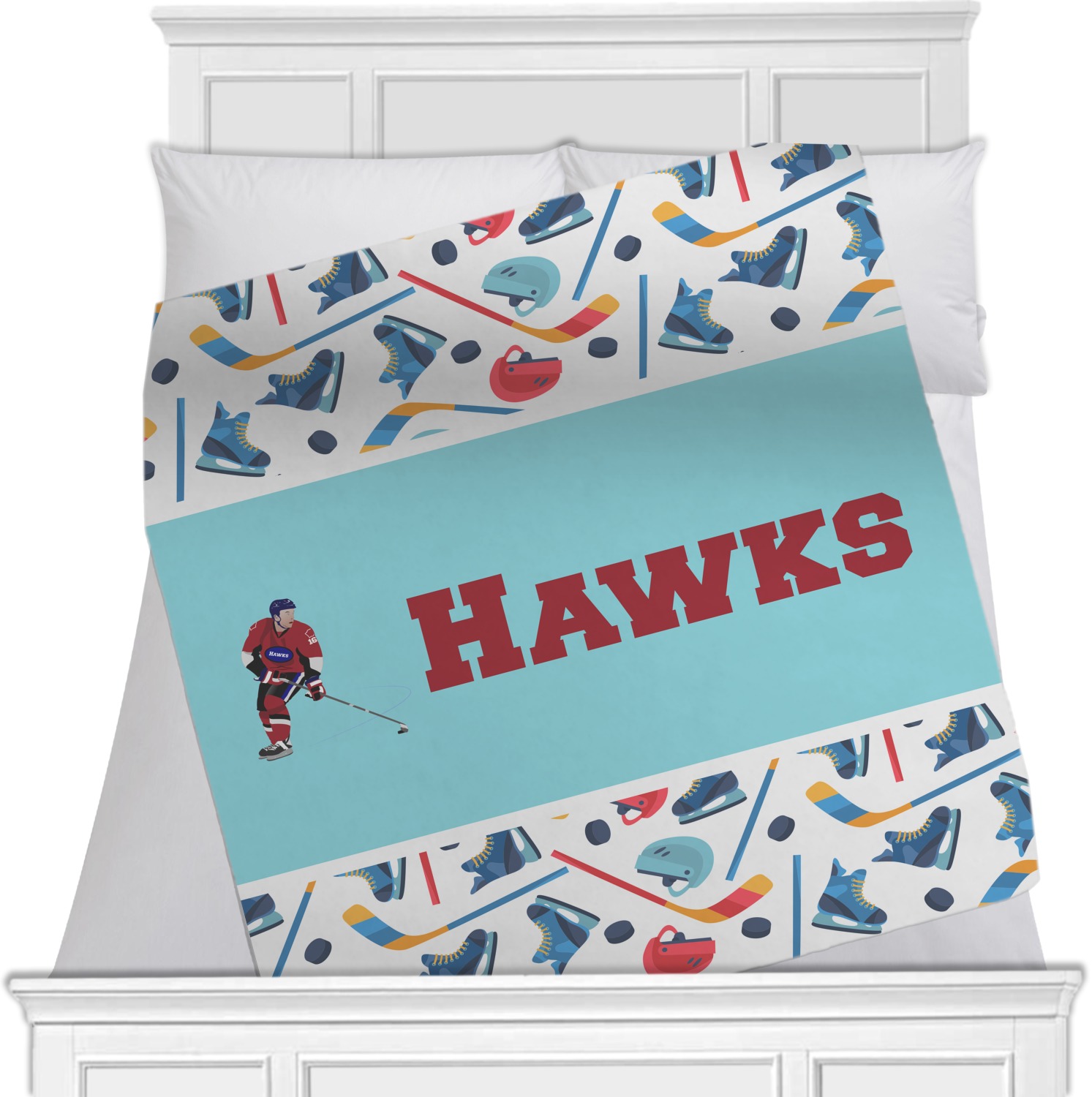 The main design has a fun background with illustrated hockey equipment including a helmet, hockey puck, skate, and hockey sticks. Going through the middle of the design is a solid strip of light teal with a graphic of a hockey player alongside a team name. The coordinating design uses this solid teal background with a hockey stick graphic and personalization.