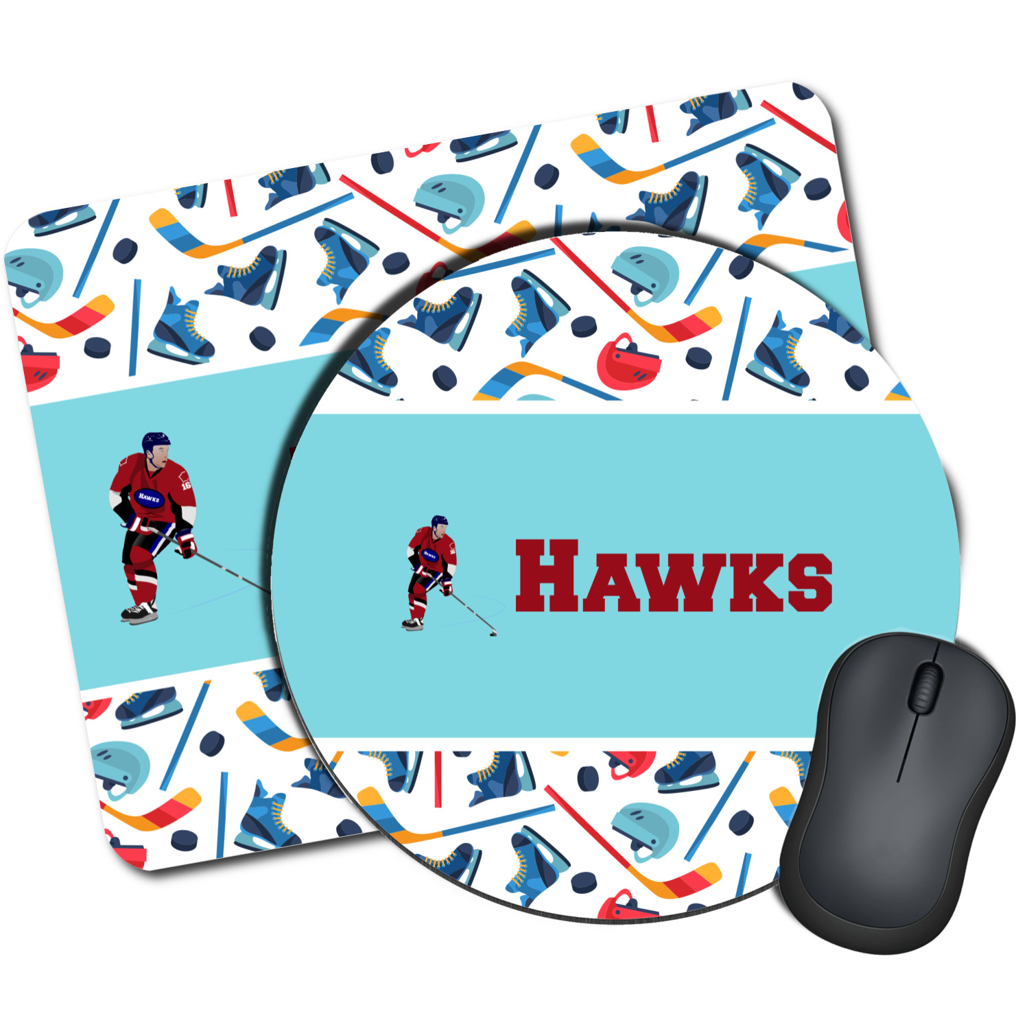 The main design has a fun background with illustrated hockey equipment including a helmet, hockey puck, skate, and hockey sticks. Going through the middle of the design is a solid strip of light teal with a graphic of a hockey player alongside a team name. The coordinating design uses this solid teal background with a hockey stick graphic and personalization.