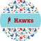 The main design has a fun background with illustrated hockey equipment including a helmet, hockey puck, skate, and hockey sticks. Going through the middle of the design is a solid strip of light teal with a graphic of a hockey player alongside a team name. The coordinating design uses this solid teal background with a hockey stick graphic and personalization.