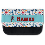 The main design has a fun background with illustrated hockey equipment including a helmet, hockey puck, skate, and hockey sticks. Going through the middle of the design is a solid strip of light teal with a graphic of a hockey player alongside a team name. The coordinating design uses this solid teal background with a hockey stick graphic and personalization.
