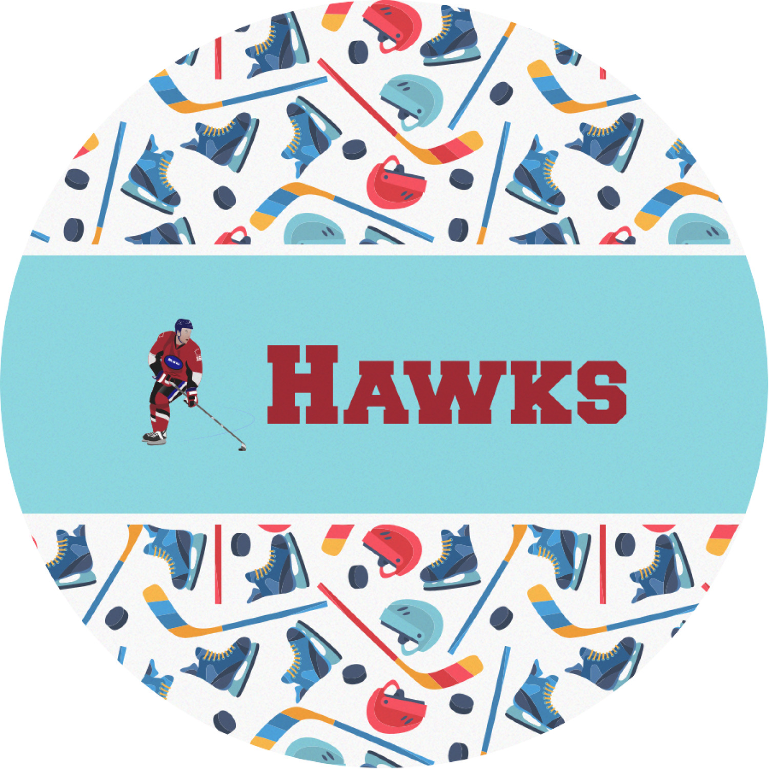 The main design has a fun background with illustrated hockey equipment including a helmet, hockey puck, skate, and hockey sticks. Going through the middle of the design is a solid strip of light teal with a graphic of a hockey player alongside a team name. The coordinating design uses this solid teal background with a hockey stick graphic and personalization.
