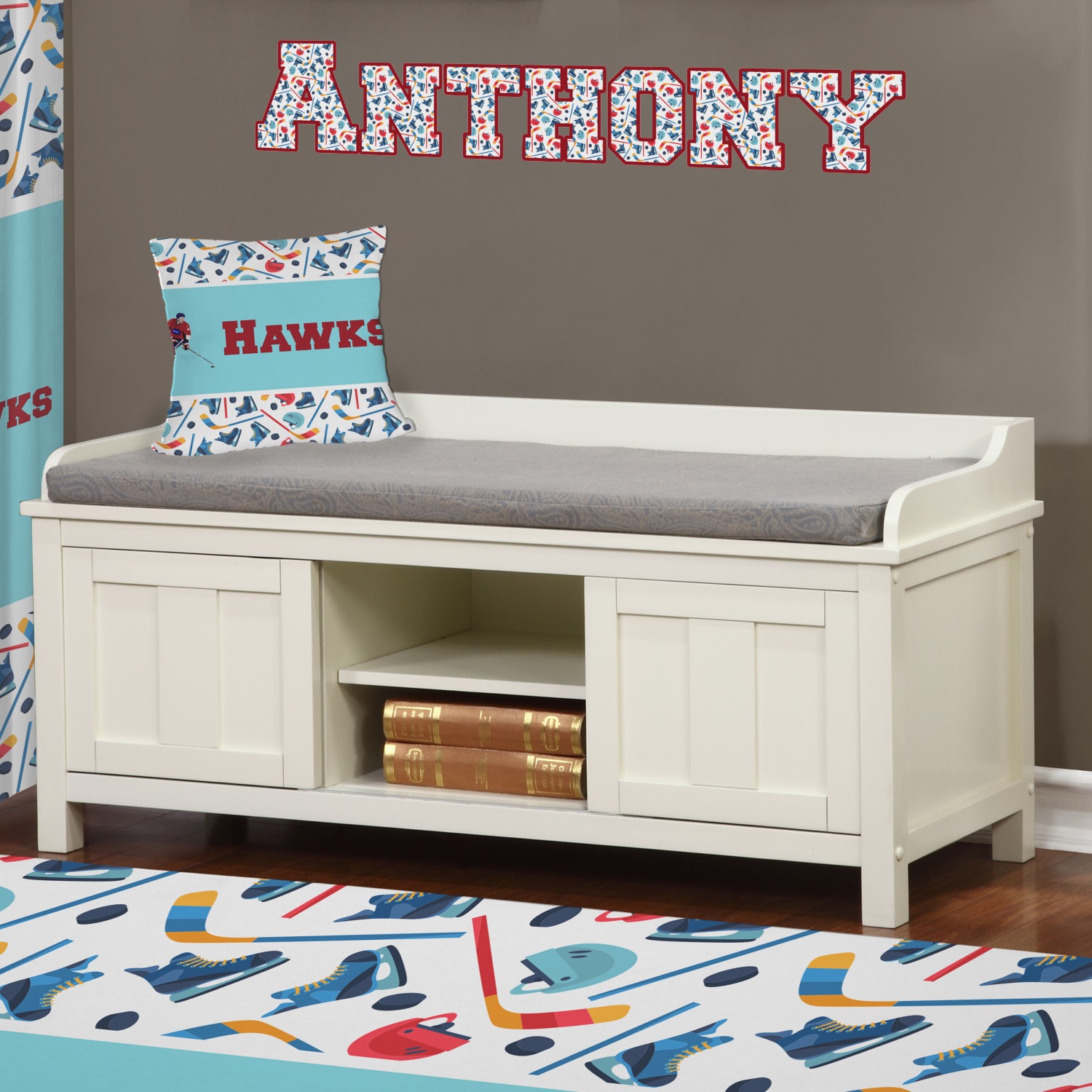 The main design has a fun background with illustrated hockey equipment including a helmet, hockey puck, skate, and hockey sticks. Going through the middle of the design is a solid strip of light teal with a graphic of a hockey player alongside a team name. The coordinating design uses this solid teal background with a hockey stick graphic and personalization.