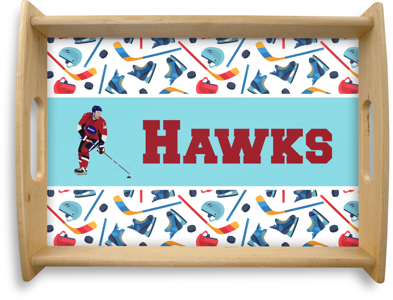 The main design has a fun background with illustrated hockey equipment including a helmet, hockey puck, skate, and hockey sticks. Going through the middle of the design is a solid strip of light teal with a graphic of a hockey player alongside a team name. The coordinating design uses this solid teal background with a hockey stick graphic and personalization.