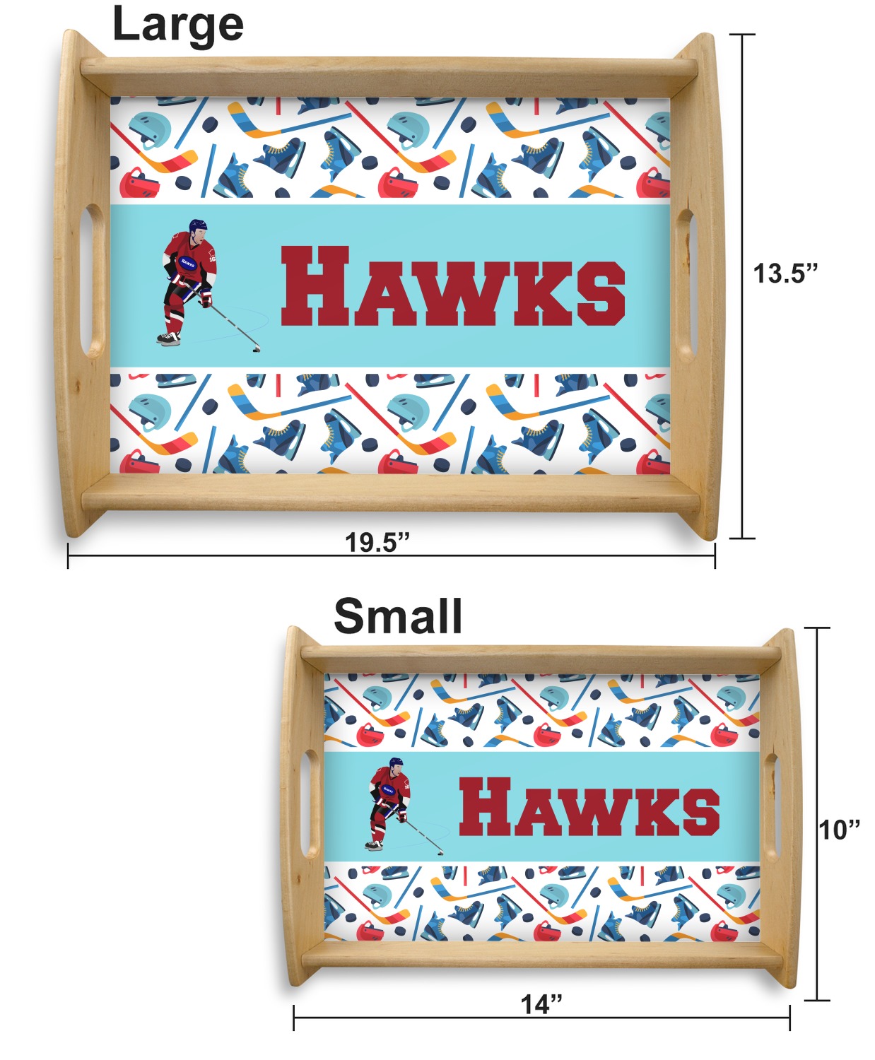 This serving tray with handles features square edges and two rounded sides, creating a very modern look. Each side is fabricated from a beautifully cut, natural wood. The bottom of the interior of the tray displays your customized design in bright, vibrant color. The tray is sold in both a black color and a natural wood look. Each variation of the wood serving tray has two sizes: Small, which is 14" x 10" x 2.25", and Large, which is 19.5" x 13.5" x 2.75".