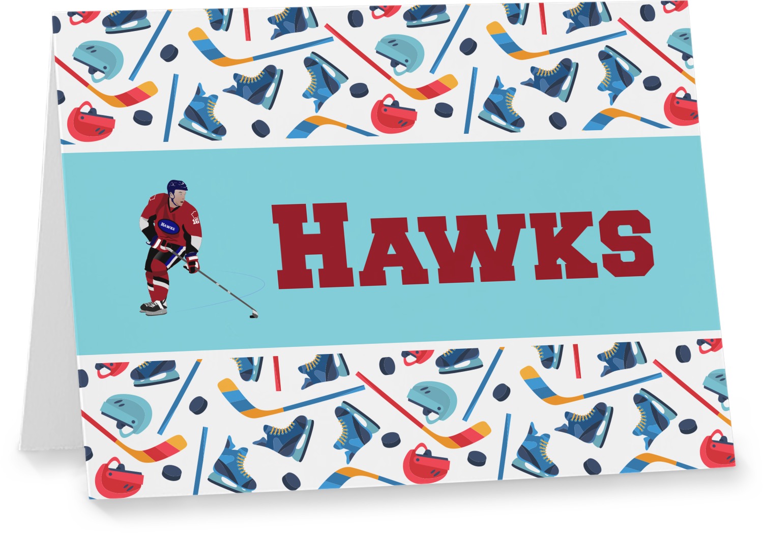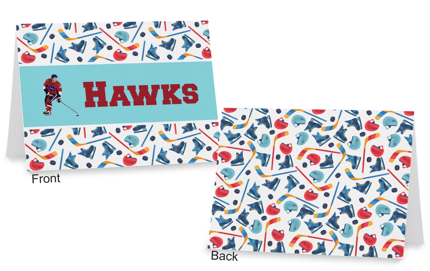 The main design has a fun background with illustrated hockey equipment including a helmet, hockey puck, skate, and hockey sticks. Going through the middle of the design is a solid strip of light teal with a graphic of a hockey player alongside a team name. The coordinating design uses this solid teal background with a hockey stick graphic and personalization.