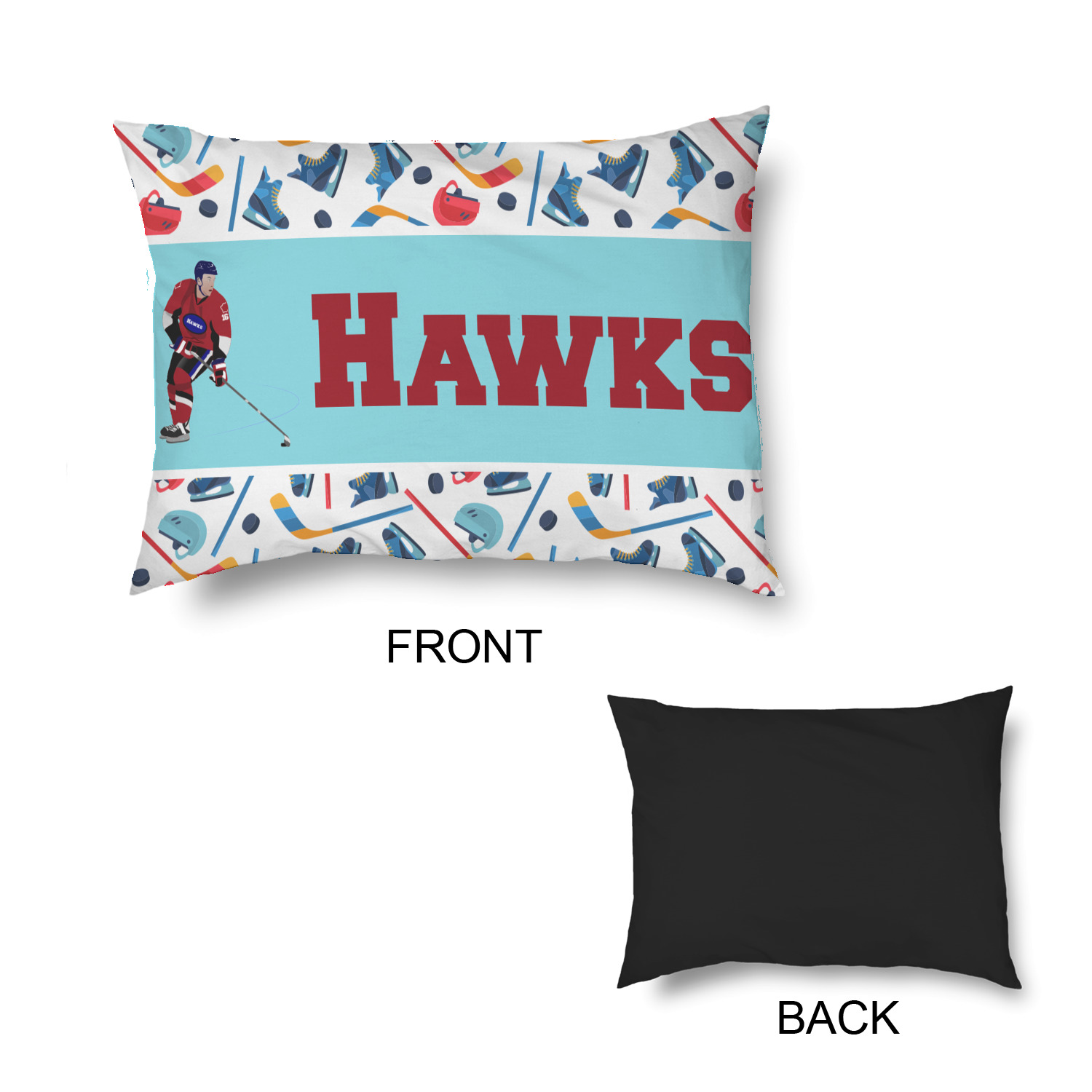 The main design has a fun background with illustrated hockey equipment including a helmet, hockey puck, skate, and hockey sticks. Going through the middle of the design is a solid strip of light teal with a graphic of a hockey player alongside a team name. The coordinating design uses this solid teal background with a hockey stick graphic and personalization.