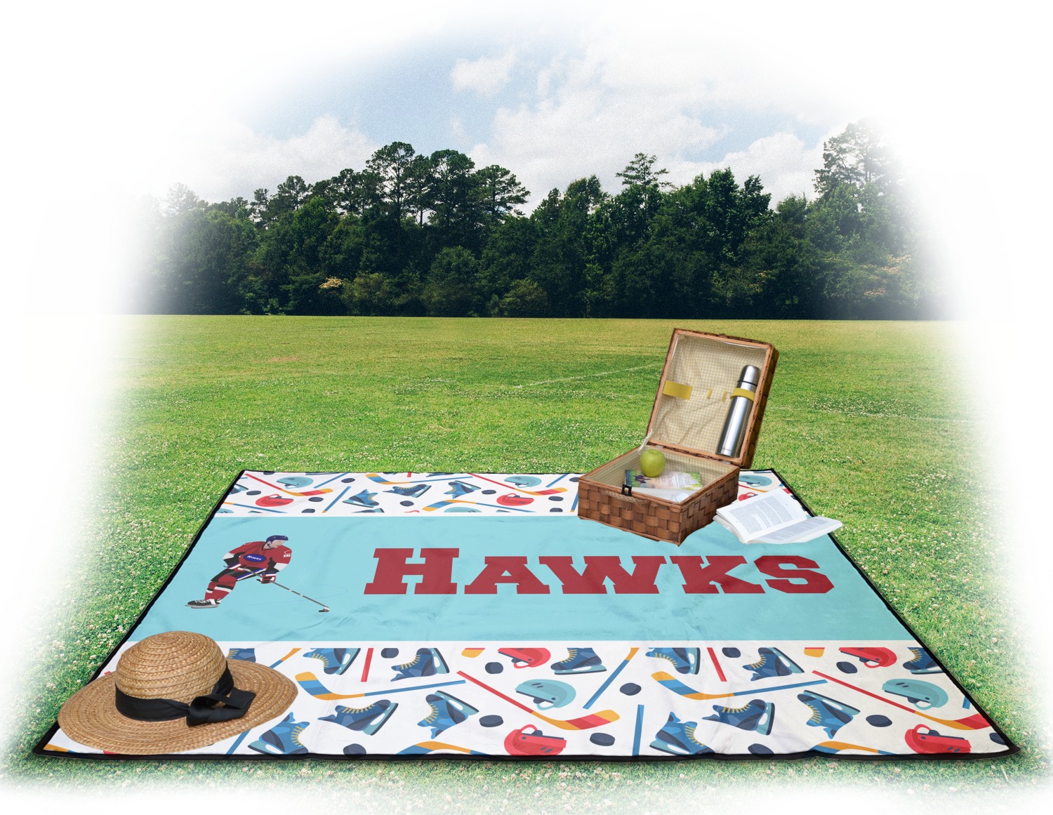 This picnic blanket is perfect for hanging out with your friends at the park or anywhere outside. The top of the blanket is made of a super soft microfiber fleece. The bottom of the blanket is made of a black material similar to a rain jacket and is water repellent as well. This will keep any wet spots on the ground from soaking through your picnic blanket. No one likes a wet blanket. The blanket measures at approximately 50" x 59" and has a nicely finished ribbon edge.