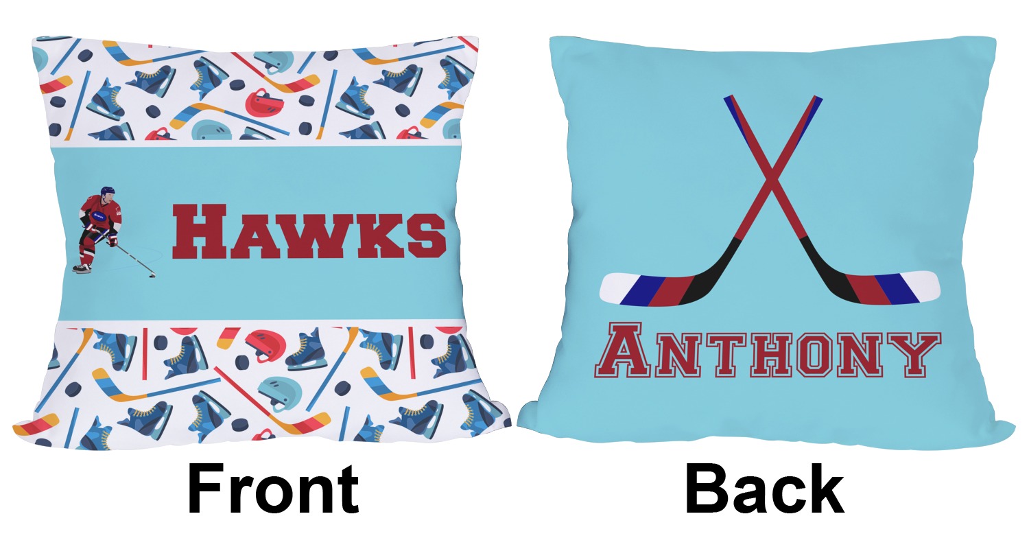 The main design has a fun background with illustrated hockey equipment including a helmet, hockey puck, skate, and hockey sticks. Going through the middle of the design is a solid strip of light teal with a graphic of a hockey player alongside a team name. The coordinating design uses this solid teal background with a hockey stick graphic and personalization.