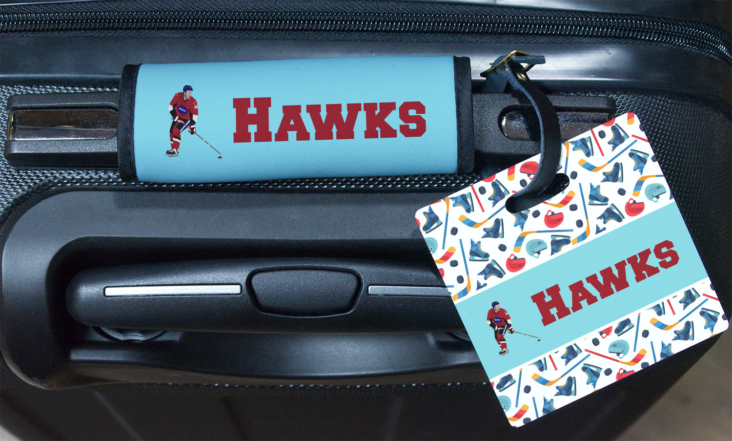 The main design has a fun background with illustrated hockey equipment including a helmet, hockey puck, skate, and hockey sticks. Going through the middle of the design is a solid strip of light teal with a graphic of a hockey player alongside a team name. The coordinating design uses this solid teal background with a hockey stick graphic and personalization.