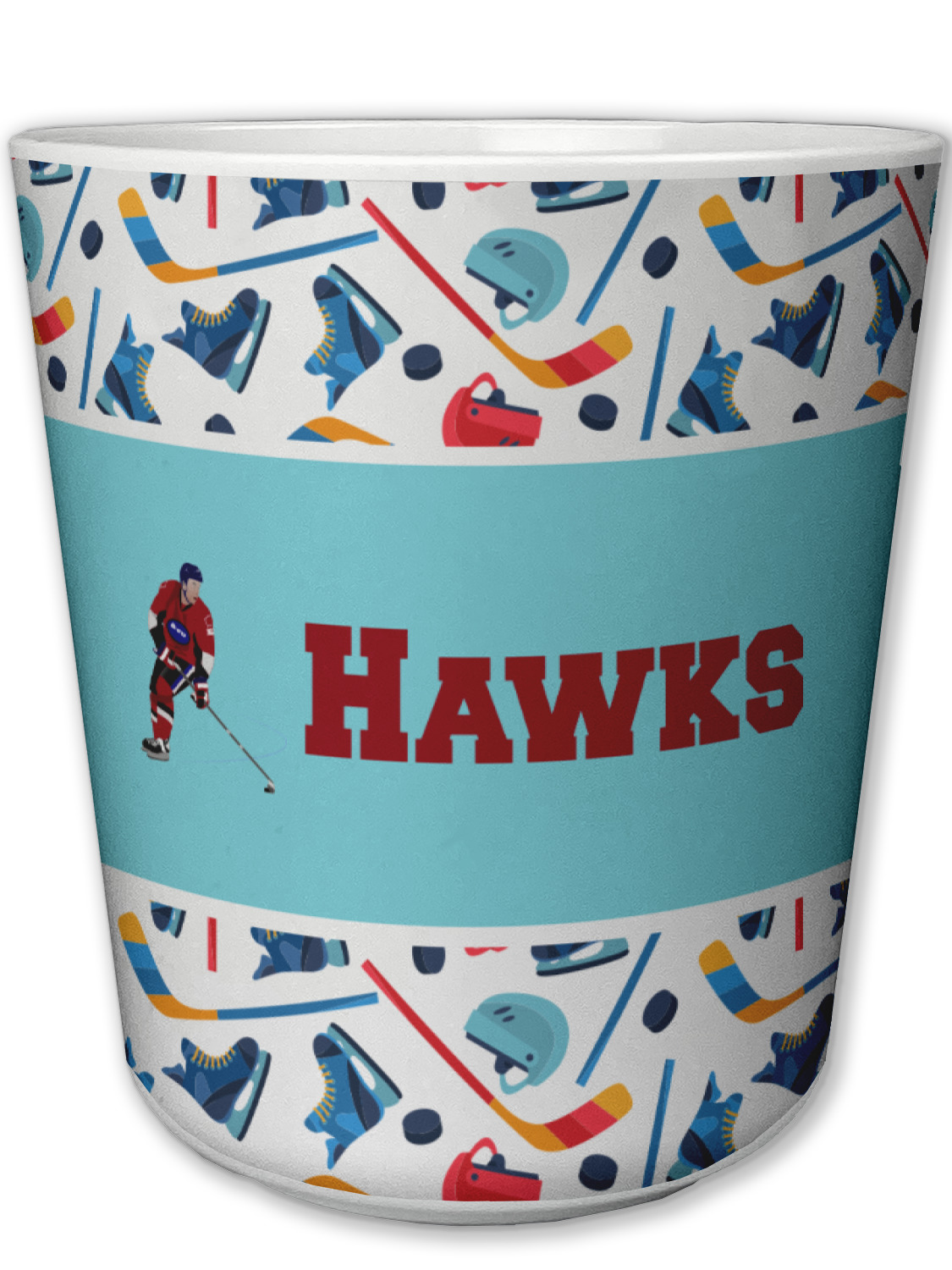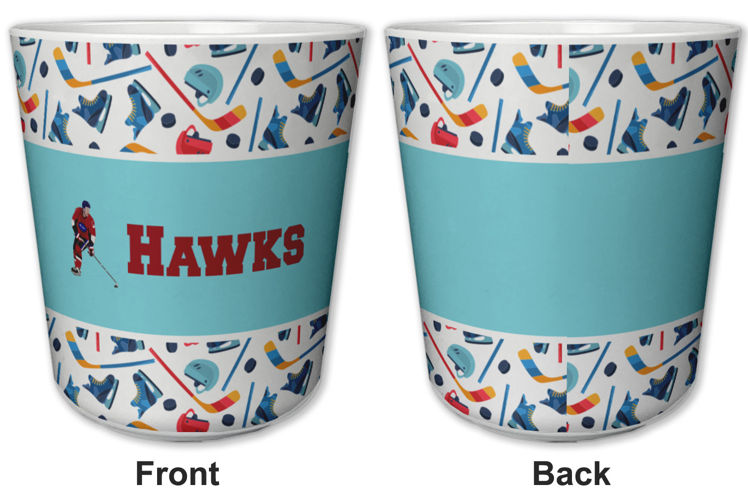 The main design has a fun background with illustrated hockey equipment including a helmet, hockey puck, skate, and hockey sticks. Going through the middle of the design is a solid strip of light teal with a graphic of a hockey player alongside a team name. The coordinating design uses this solid teal background with a hockey stick graphic and personalization.