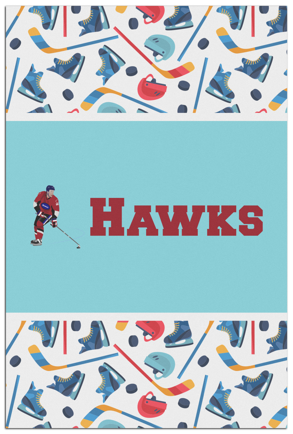 The main design has a fun background with illustrated hockey equipment including a helmet, hockey puck, skate, and hockey sticks. Going through the middle of the design is a solid strip of light teal with a graphic of a hockey player alongside a team name. The coordinating design uses this solid teal background with a hockey stick graphic and personalization.
