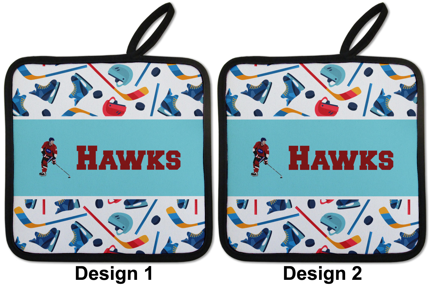 The main design has a fun background with illustrated hockey equipment including a helmet, hockey puck, skate, and hockey sticks. Going through the middle of the design is a solid strip of light teal with a graphic of a hockey player alongside a team name. The coordinating design uses this solid teal background with a hockey stick graphic and personalization.
