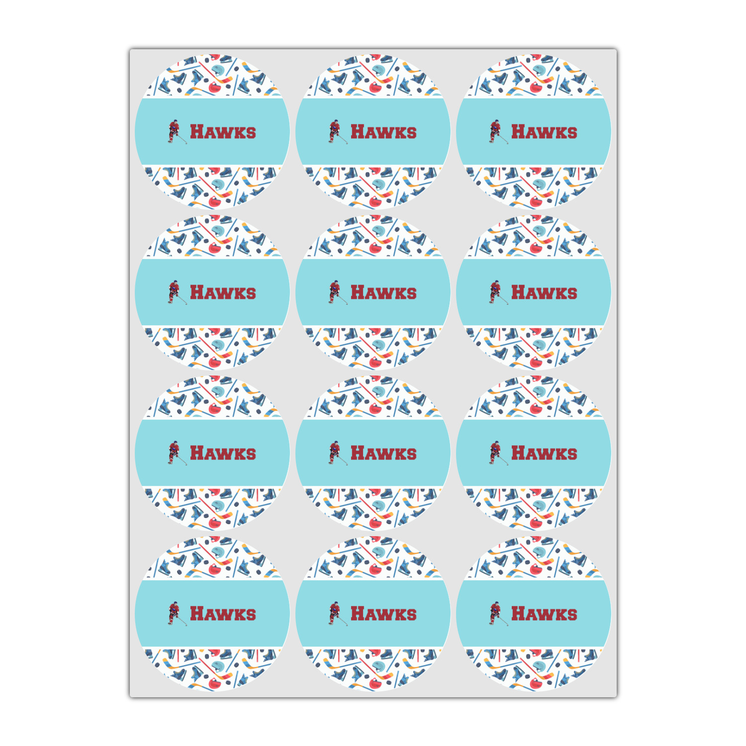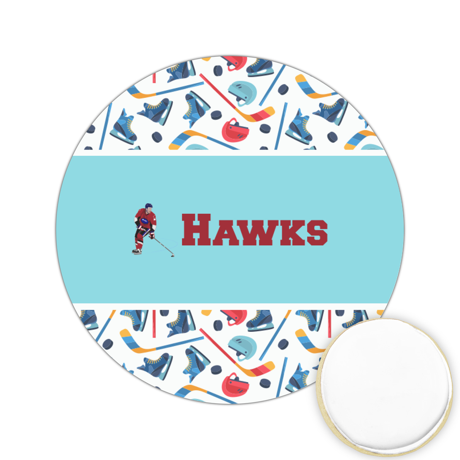 The main design has a fun background with illustrated hockey equipment including a helmet, hockey puck, skate, and hockey sticks. Going through the middle of the design is a solid strip of light teal with a graphic of a hockey player alongside a team name. The coordinating design uses this solid teal background with a hockey stick graphic and personalization.