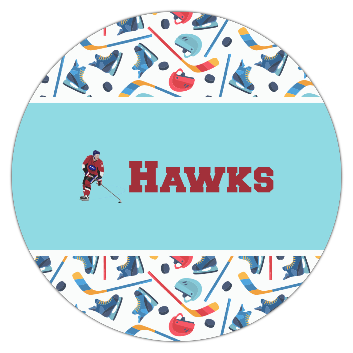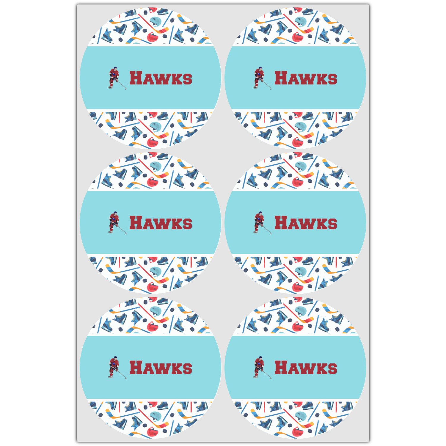 The main design has a fun background with illustrated hockey equipment including a helmet, hockey puck, skate, and hockey sticks. Going through the middle of the design is a solid strip of light teal with a graphic of a hockey player alongside a team name. The coordinating design uses this solid teal background with a hockey stick graphic and personalization.