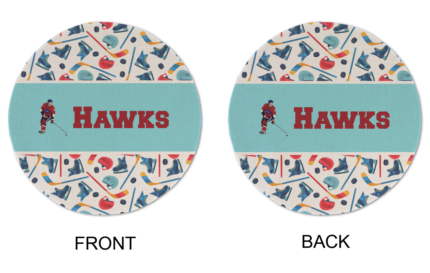 The main design has a fun background with illustrated hockey equipment including a helmet, hockey puck, skate, and hockey sticks. Going through the middle of the design is a solid strip of light teal with a graphic of a hockey player alongside a team name. The coordinating design uses this solid teal background with a hockey stick graphic and personalization.