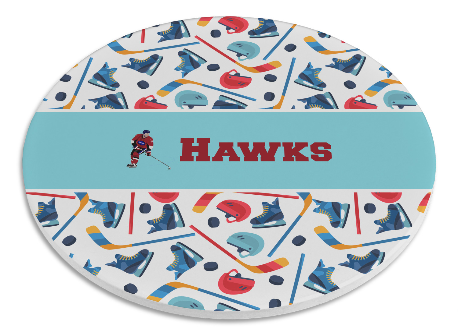 The main design has a fun background with illustrated hockey equipment including a helmet, hockey puck, skate, and hockey sticks. Going through the middle of the design is a solid strip of light teal with a graphic of a hockey player alongside a team name. The coordinating design uses this solid teal background with a hockey stick graphic and personalization.