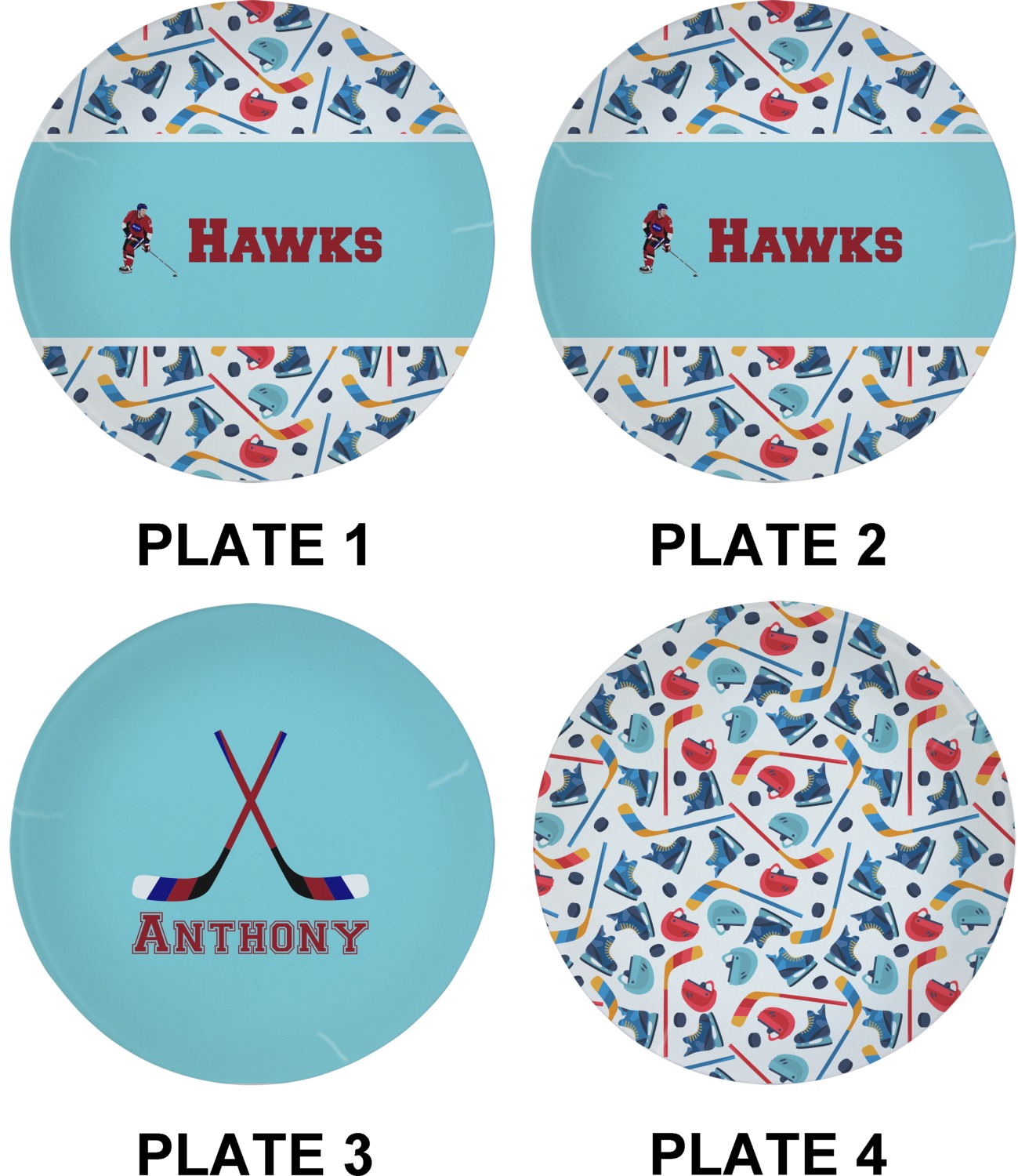 The main design has a fun background with illustrated hockey equipment including a helmet, hockey puck, skate, and hockey sticks. Going through the middle of the design is a solid strip of light teal with a graphic of a hockey player alongside a team name. The coordinating design uses this solid teal background with a hockey stick graphic and personalization.