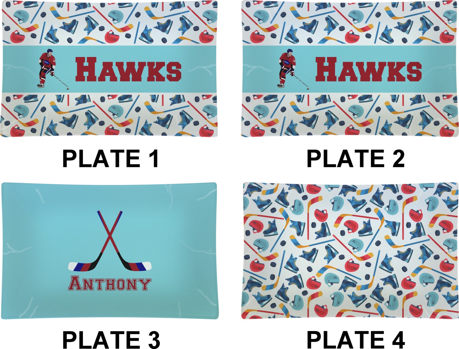 The main design has a fun background with illustrated hockey equipment including a helmet, hockey puck, skate, and hockey sticks. Going through the middle of the design is a solid strip of light teal with a graphic of a hockey player alongside a team name. The coordinating design uses this solid teal background with a hockey stick graphic and personalization.