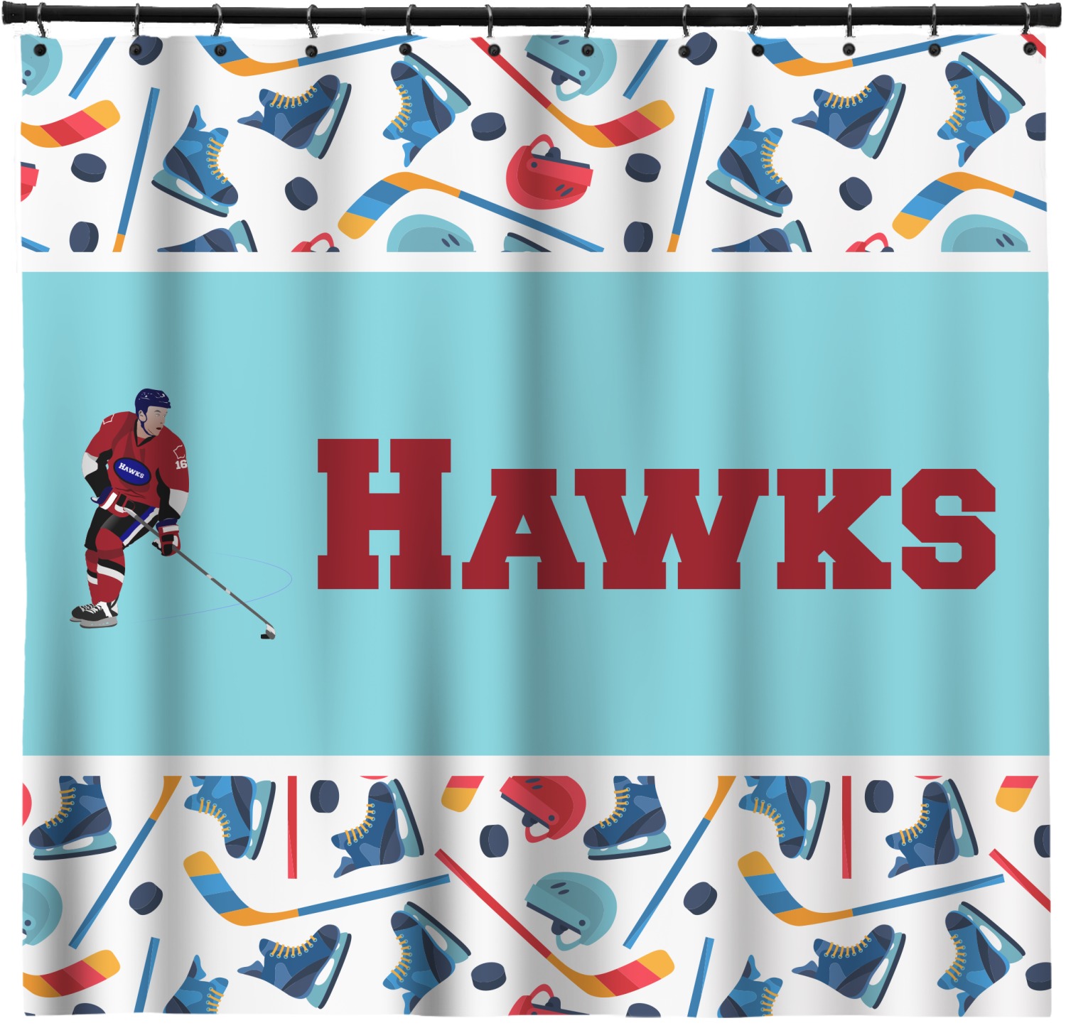 The main design has a fun background with illustrated hockey equipment including a helmet, hockey puck, skate, and hockey sticks. Going through the middle of the design is a solid strip of light teal with a graphic of a hockey player alongside a team name. The coordinating design uses this solid teal background with a hockey stick graphic and personalization.