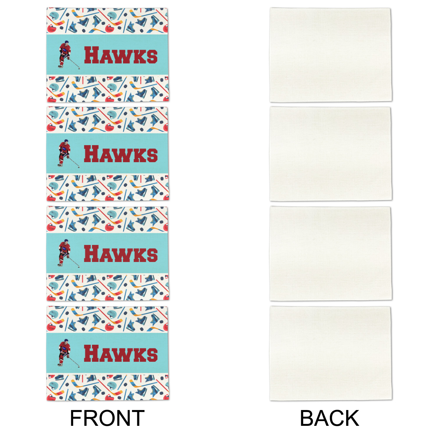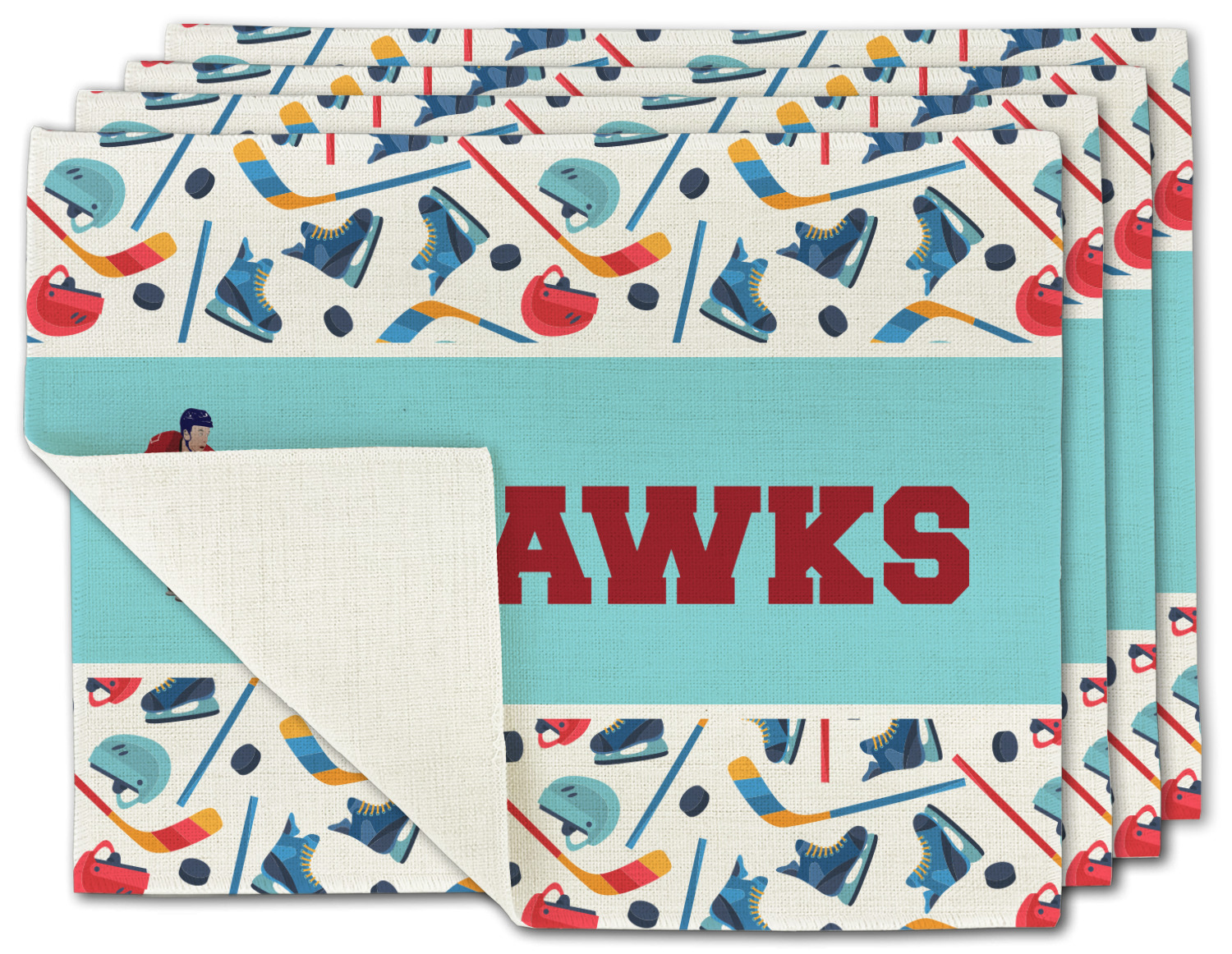 The main design has a fun background with illustrated hockey equipment including a helmet, hockey puck, skate, and hockey sticks. Going through the middle of the design is a solid strip of light teal with a graphic of a hockey player alongside a team name. The coordinating design uses this solid teal background with a hockey stick graphic and personalization.