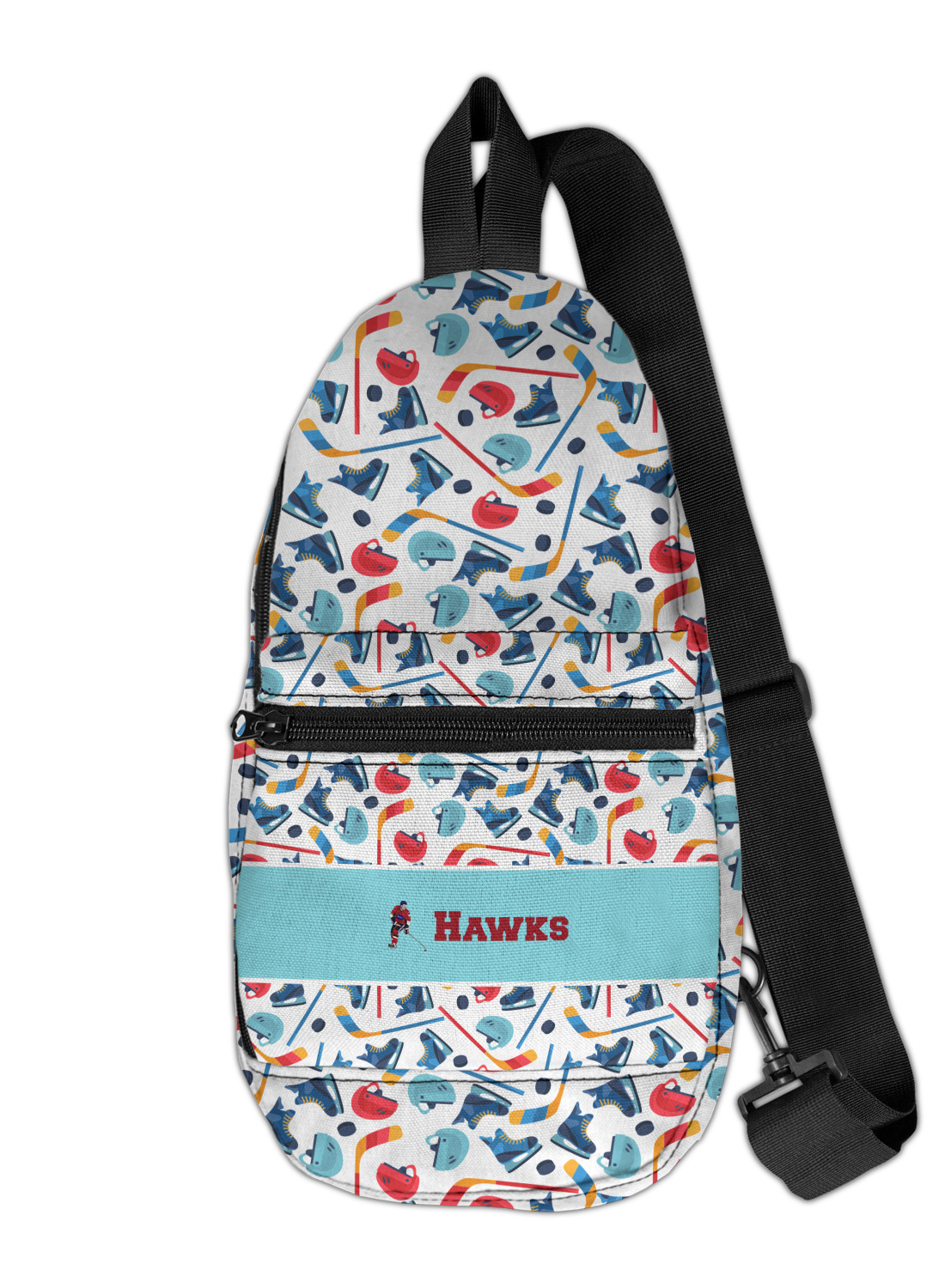 The main design has a fun background with illustrated hockey equipment including a helmet, hockey puck, skate, and hockey sticks. Going through the middle of the design is a solid strip of light teal with a graphic of a hockey player alongside a team name. The coordinating design uses this solid teal background with a hockey stick graphic and personalization.