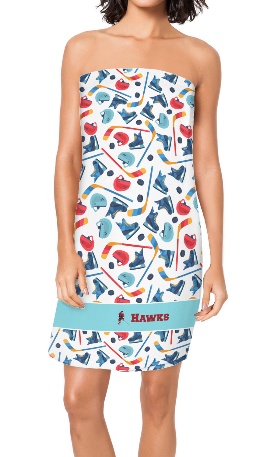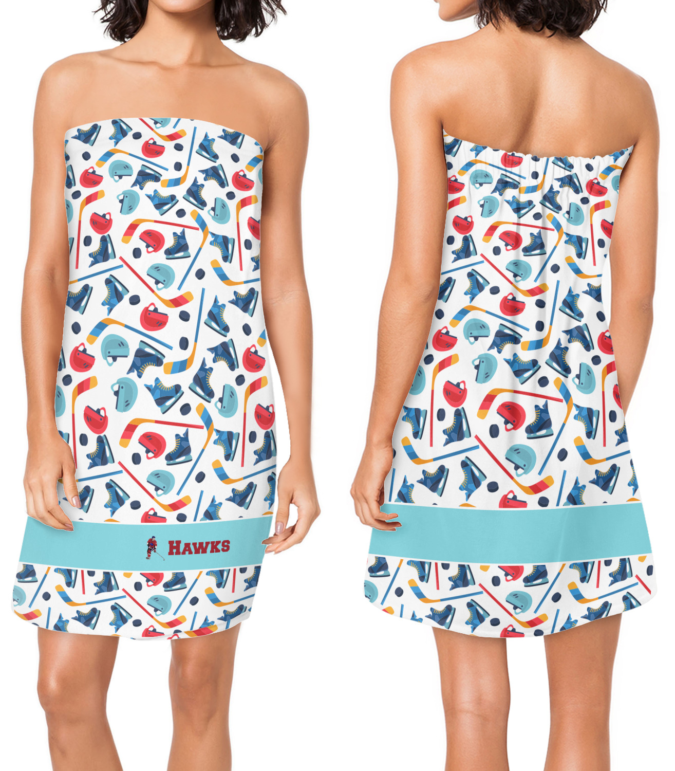 The main design has a fun background with illustrated hockey equipment including a helmet, hockey puck, skate, and hockey sticks. Going through the middle of the design is a solid strip of light teal with a graphic of a hockey player alongside a team name. The coordinating design uses this solid teal background with a hockey stick graphic and personalization.
