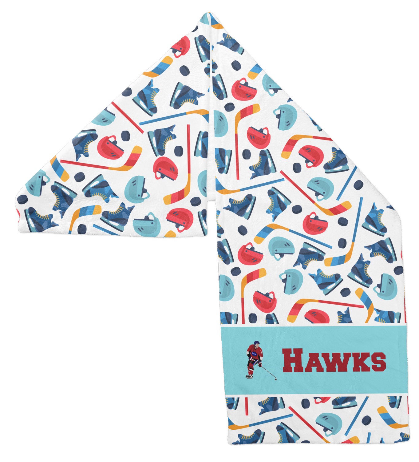 The main design has a fun background with illustrated hockey equipment including a helmet, hockey puck, skate, and hockey sticks. Going through the middle of the design is a solid strip of light teal with a graphic of a hockey player alongside a team name. The coordinating design uses this solid teal background with a hockey stick graphic and personalization.