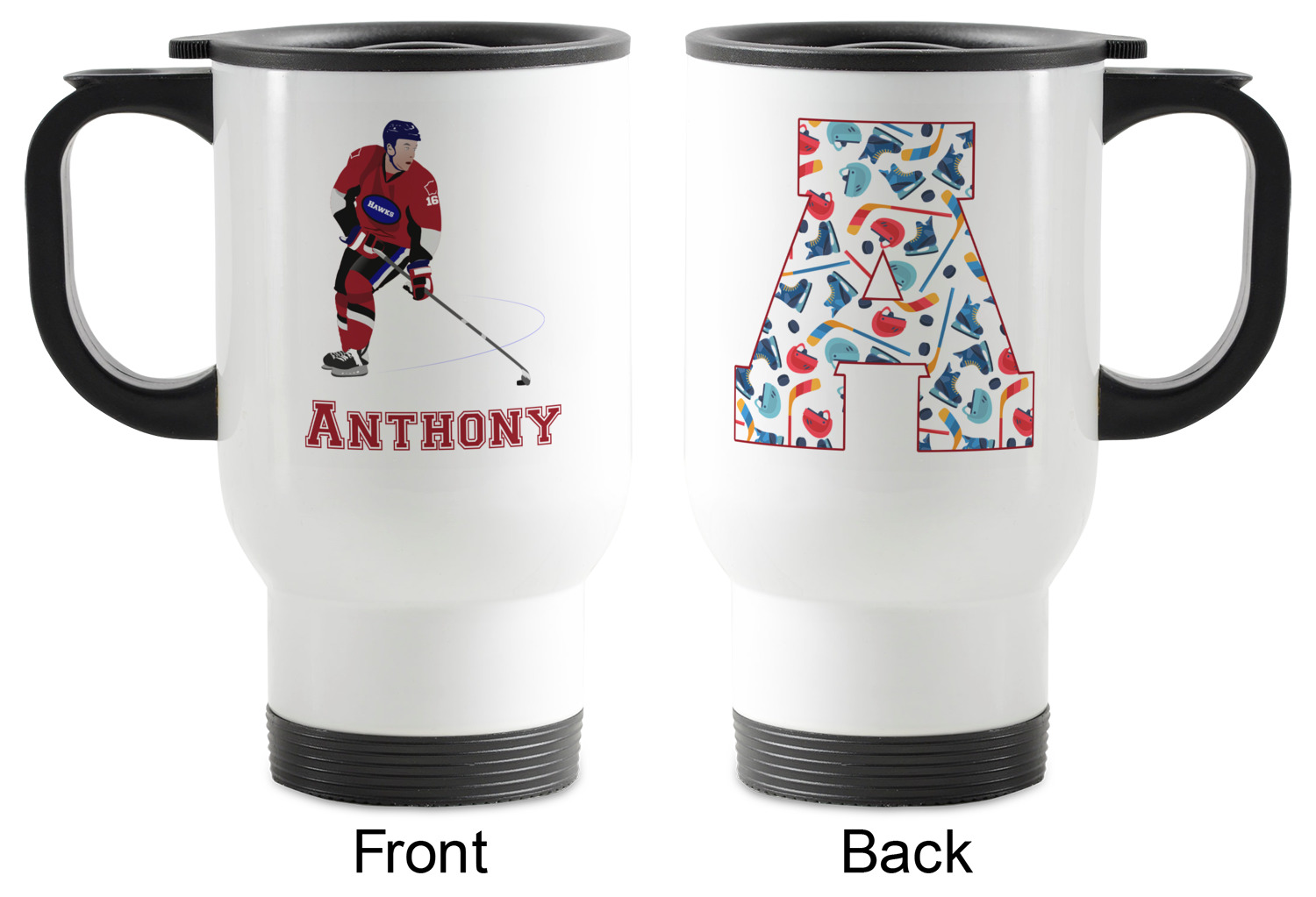 The main design has a fun background with illustrated hockey equipment including a helmet, hockey puck, skate, and hockey sticks. Going through the middle of the design is a solid strip of light teal with a graphic of a hockey player alongside a team name. The coordinating design uses this solid teal background with a hockey stick graphic and personalization.