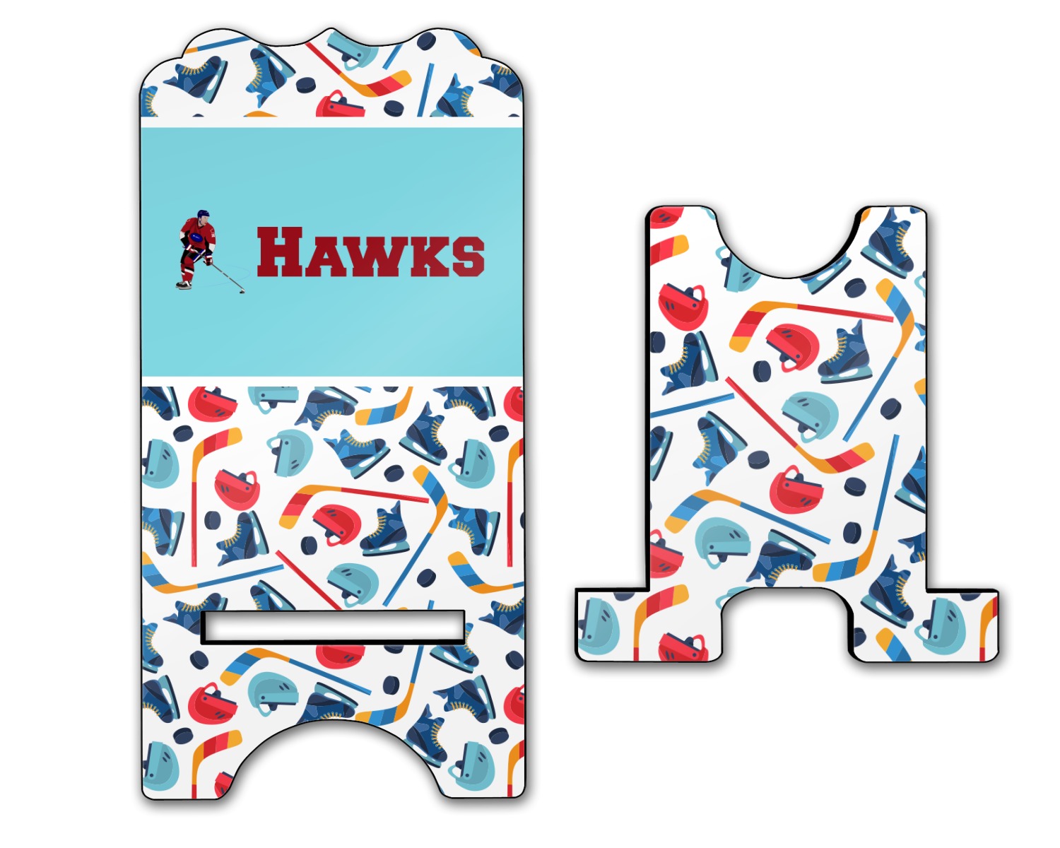 The main design has a fun background with illustrated hockey equipment including a helmet, hockey puck, skate, and hockey sticks. Going through the middle of the design is a solid strip of light teal with a graphic of a hockey player alongside a team name. The coordinating design uses this solid teal background with a hockey stick graphic and personalization.