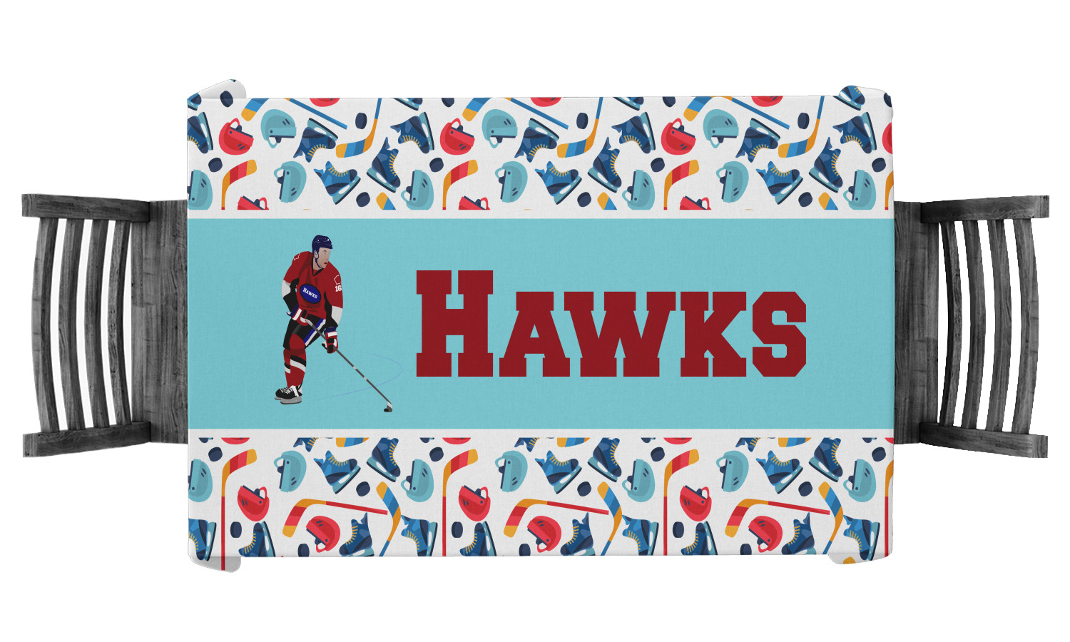 The main design has a fun background with illustrated hockey equipment including a helmet, hockey puck, skate, and hockey sticks. Going through the middle of the design is a solid strip of light teal with a graphic of a hockey player alongside a team name. The coordinating design uses this solid teal background with a hockey stick graphic and personalization.