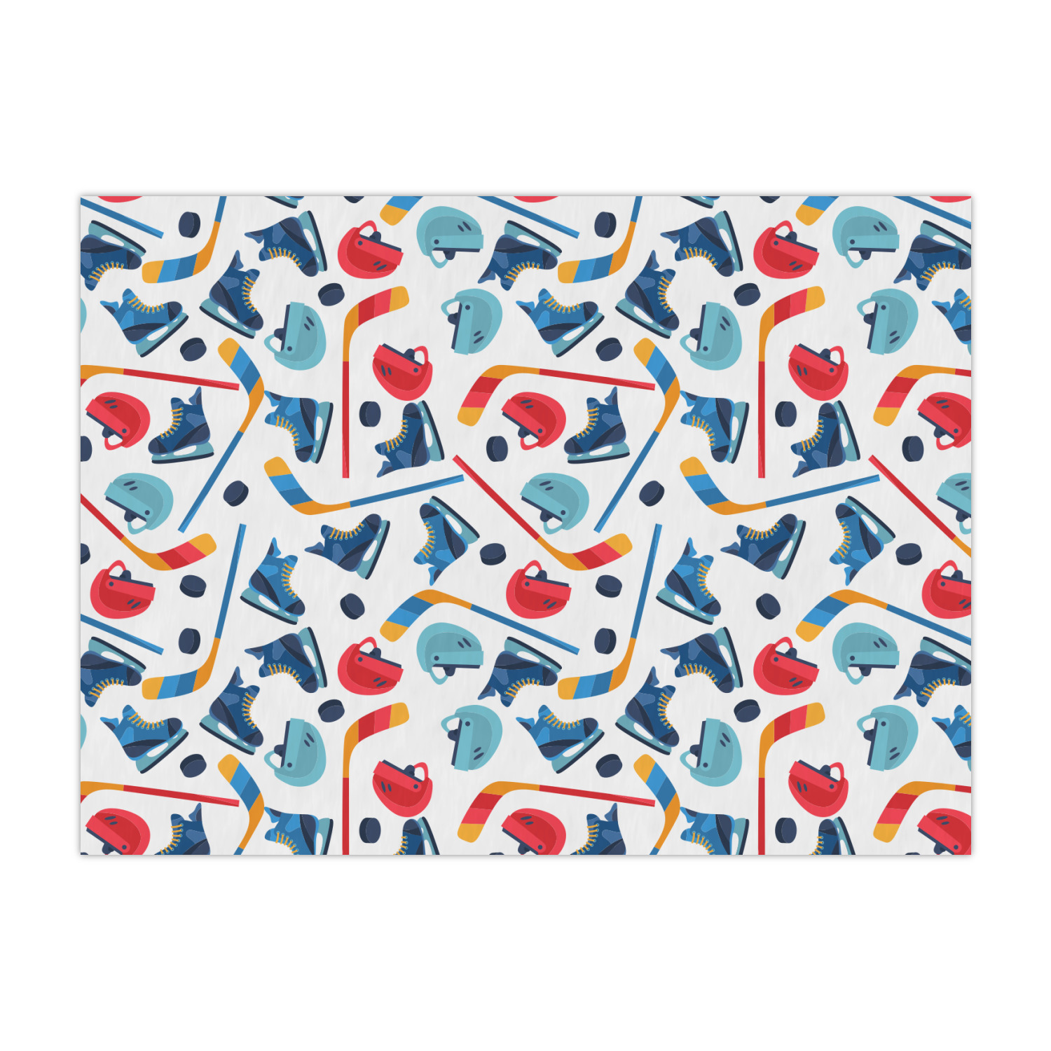 The main design has a fun background with illustrated hockey equipment including a helmet, hockey puck, skate, and hockey sticks. Going through the middle of the design is a solid strip of light teal with a graphic of a hockey player alongside a team name. The coordinating design uses this solid teal background with a hockey stick graphic and personalization.