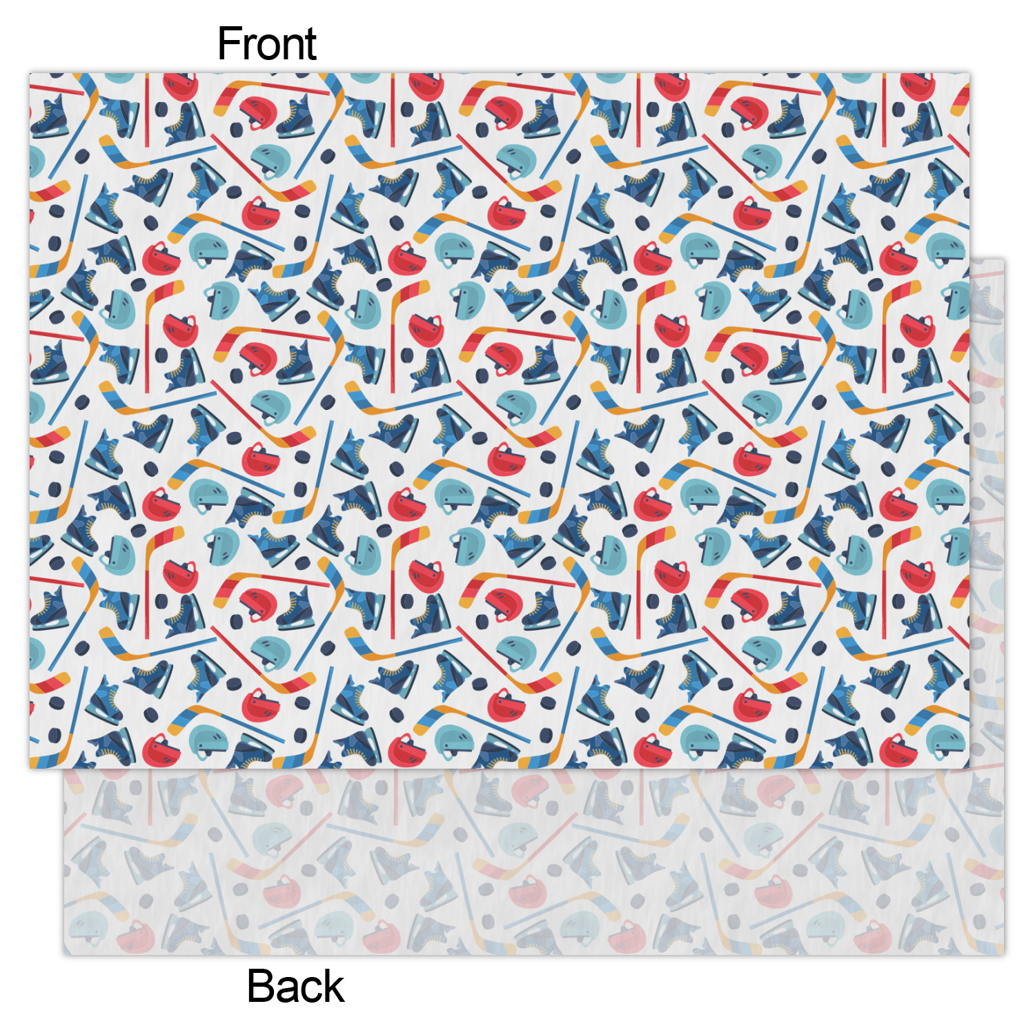 The main design has a fun background with illustrated hockey equipment including a helmet, hockey puck, skate, and hockey sticks. Going through the middle of the design is a solid strip of light teal with a graphic of a hockey player alongside a team name. The coordinating design uses this solid teal background with a hockey stick graphic and personalization.