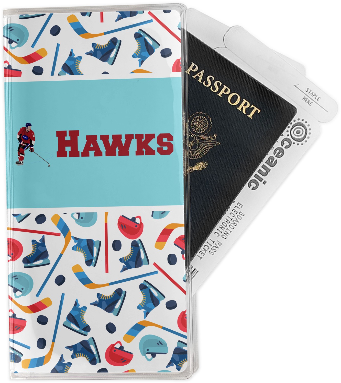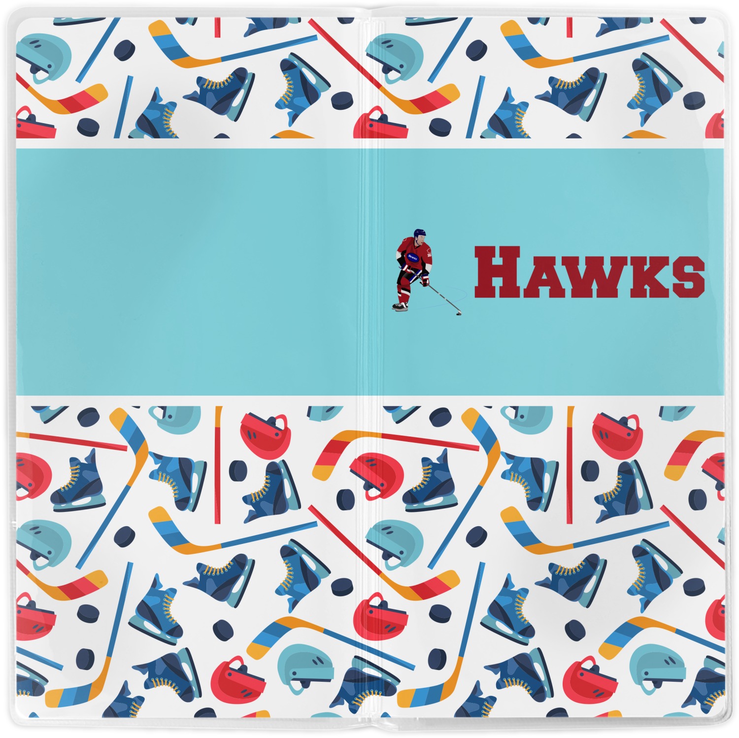 The main design has a fun background with illustrated hockey equipment including a helmet, hockey puck, skate, and hockey sticks. Going through the middle of the design is a solid strip of light teal with a graphic of a hockey player alongside a team name. The coordinating design uses this solid teal background with a hockey stick graphic and personalization.