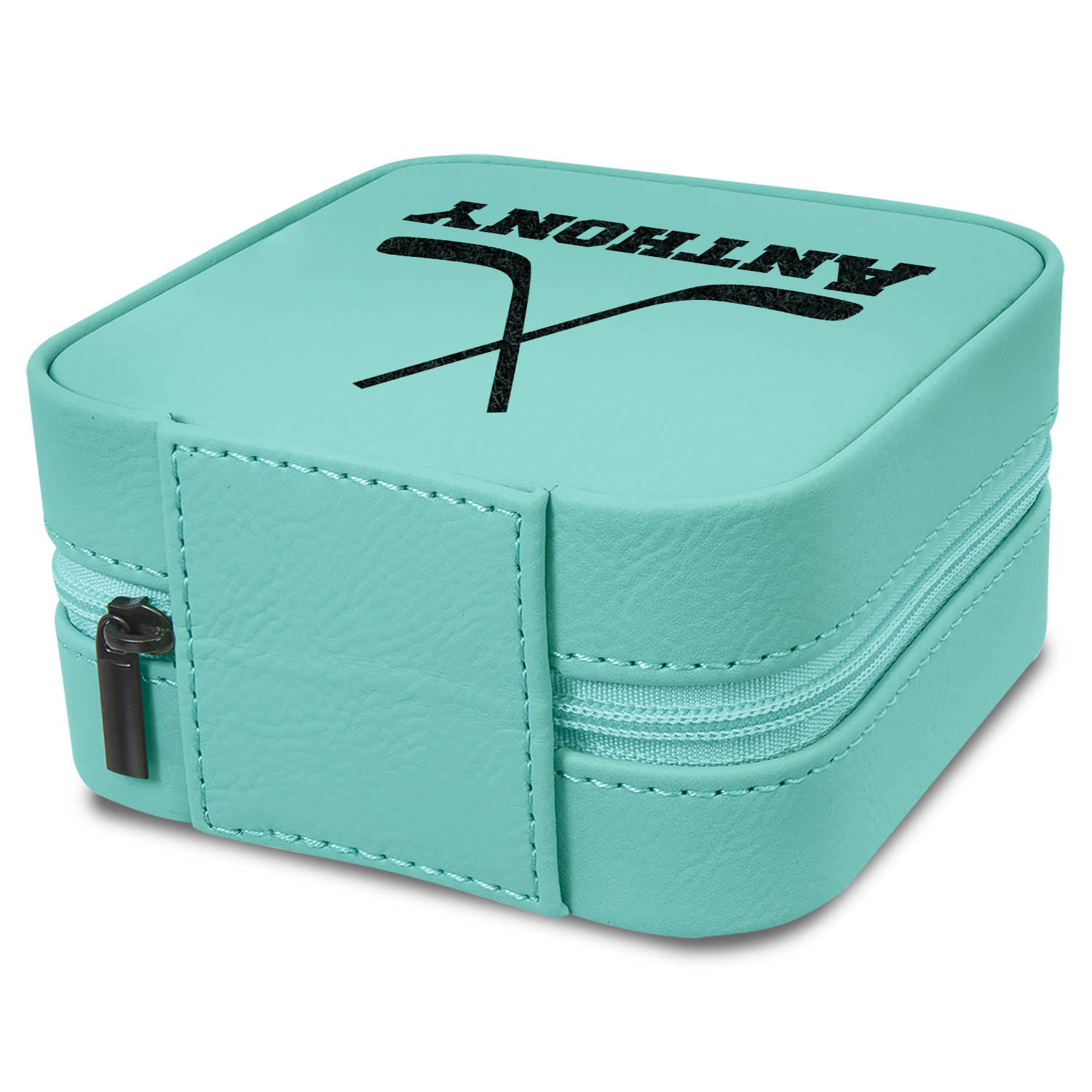 This square zippered travel jewelry box is made from leatherette and is available in four colors - classic cognac / rawhide, a beautiful teal. navy blue or pink. The tan colored soft velvet inside has compartments and hooks for all your jewelry - rings, chains, earrings, bangles etc.