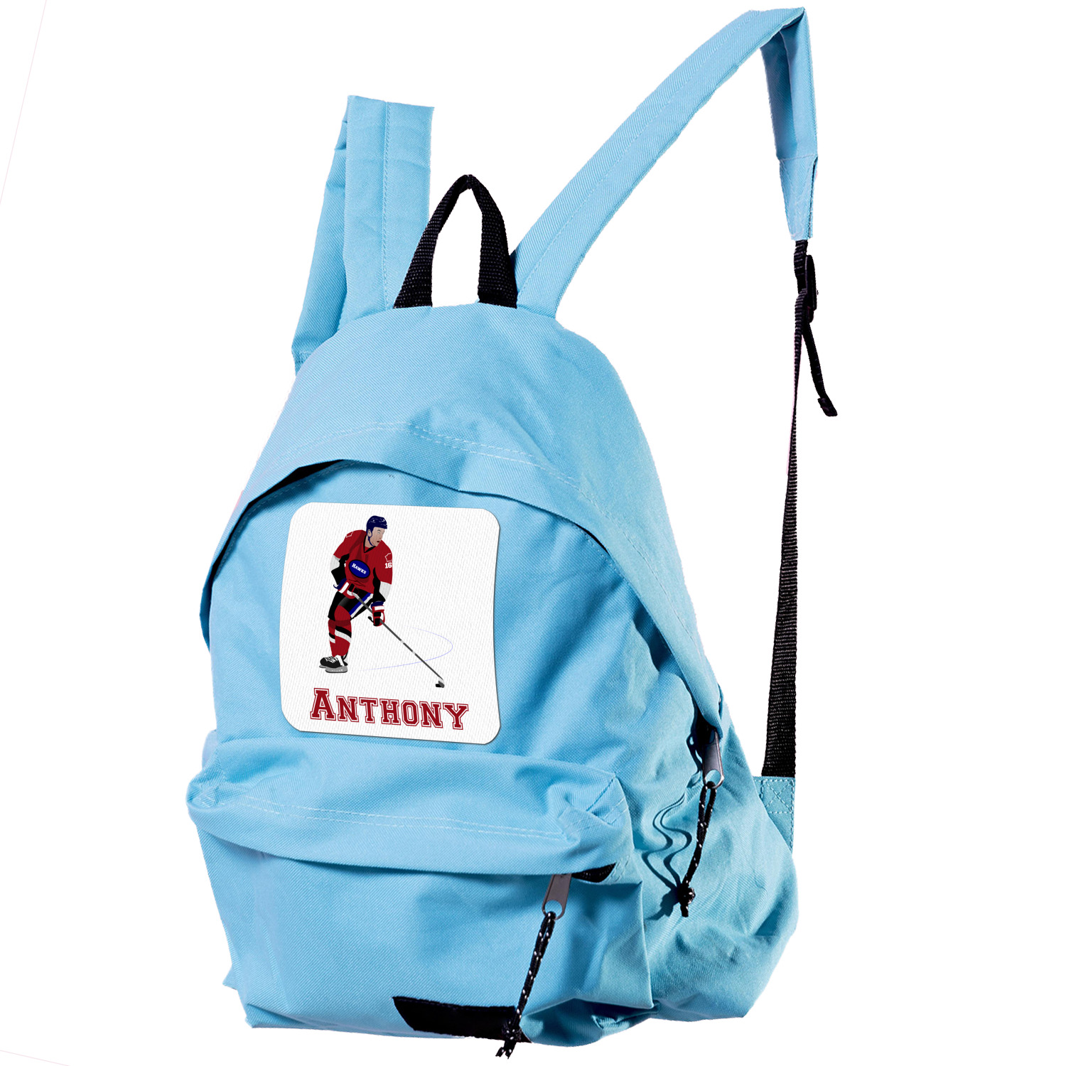 The main design has a fun background with illustrated hockey equipment including a helmet, hockey puck, skate, and hockey sticks. Going through the middle of the design is a solid strip of light teal with a graphic of a hockey player alongside a team name. The coordinating design uses this solid teal background with a hockey stick graphic and personalization.